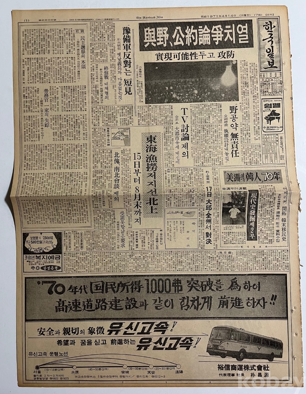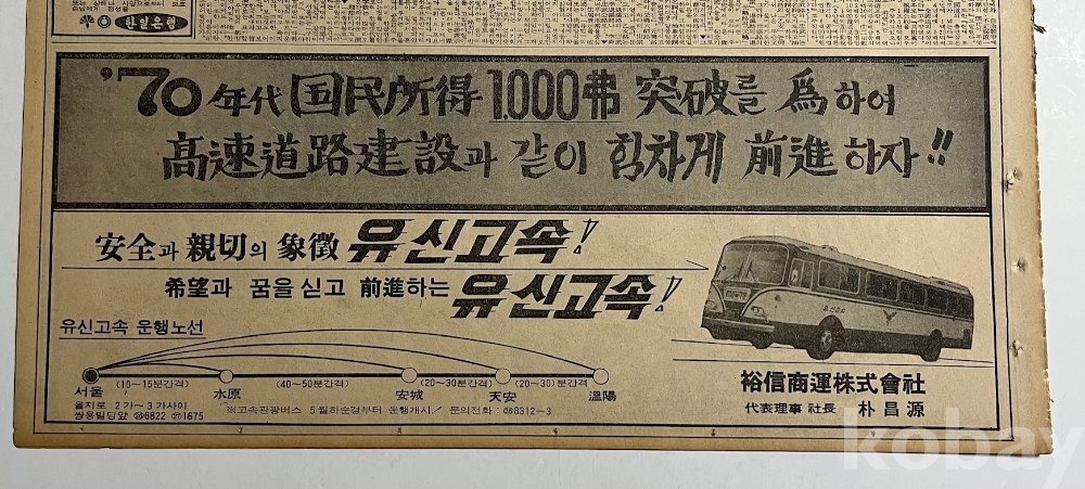 서울에서 온양까지 고속버스를 운행한다는 광고가 실린 한국일보 낱장입니다.