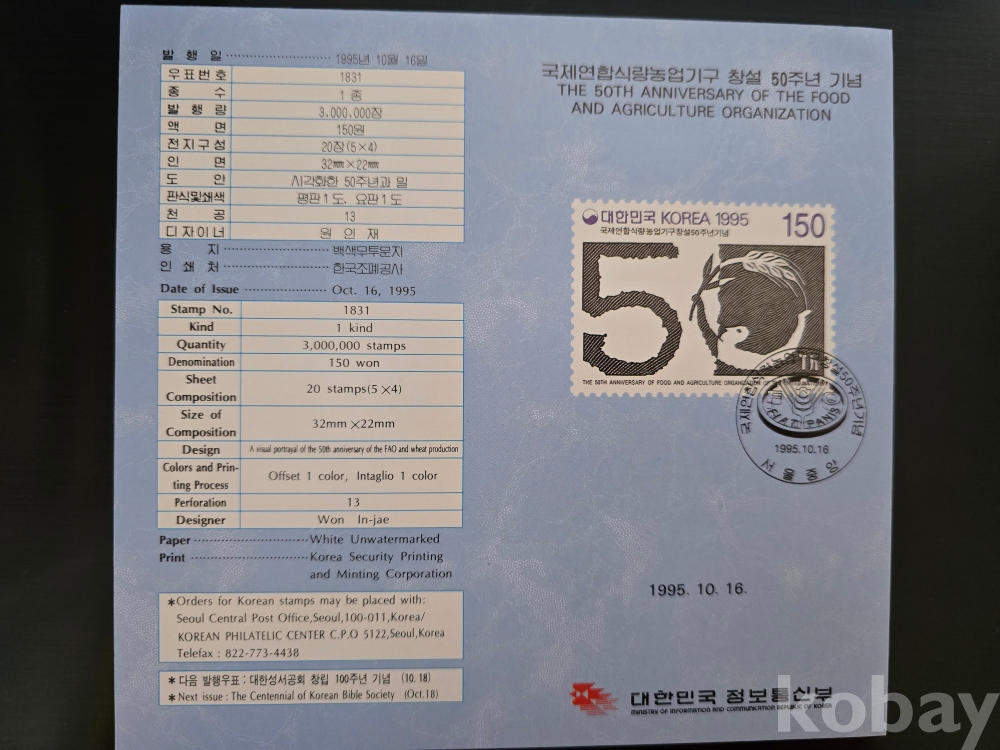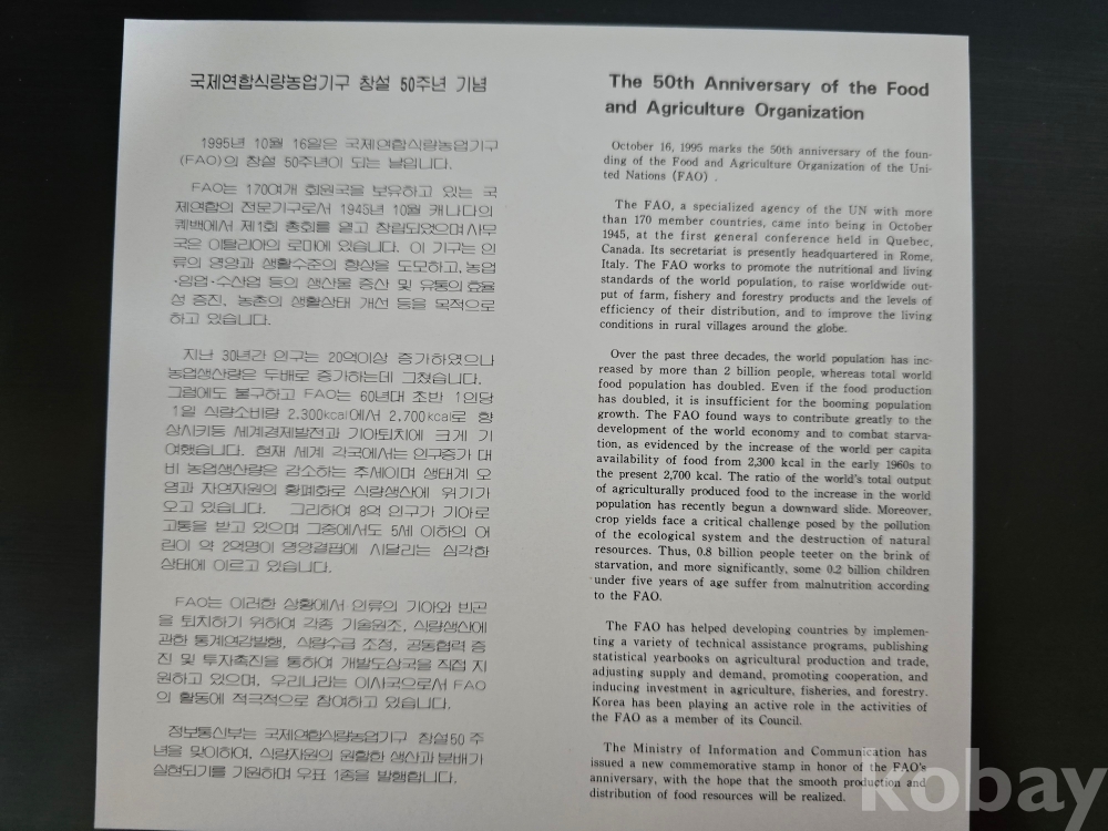 우표안내카드/95'10.16 국제연합식량농업기구 창설50주년 기념우표
