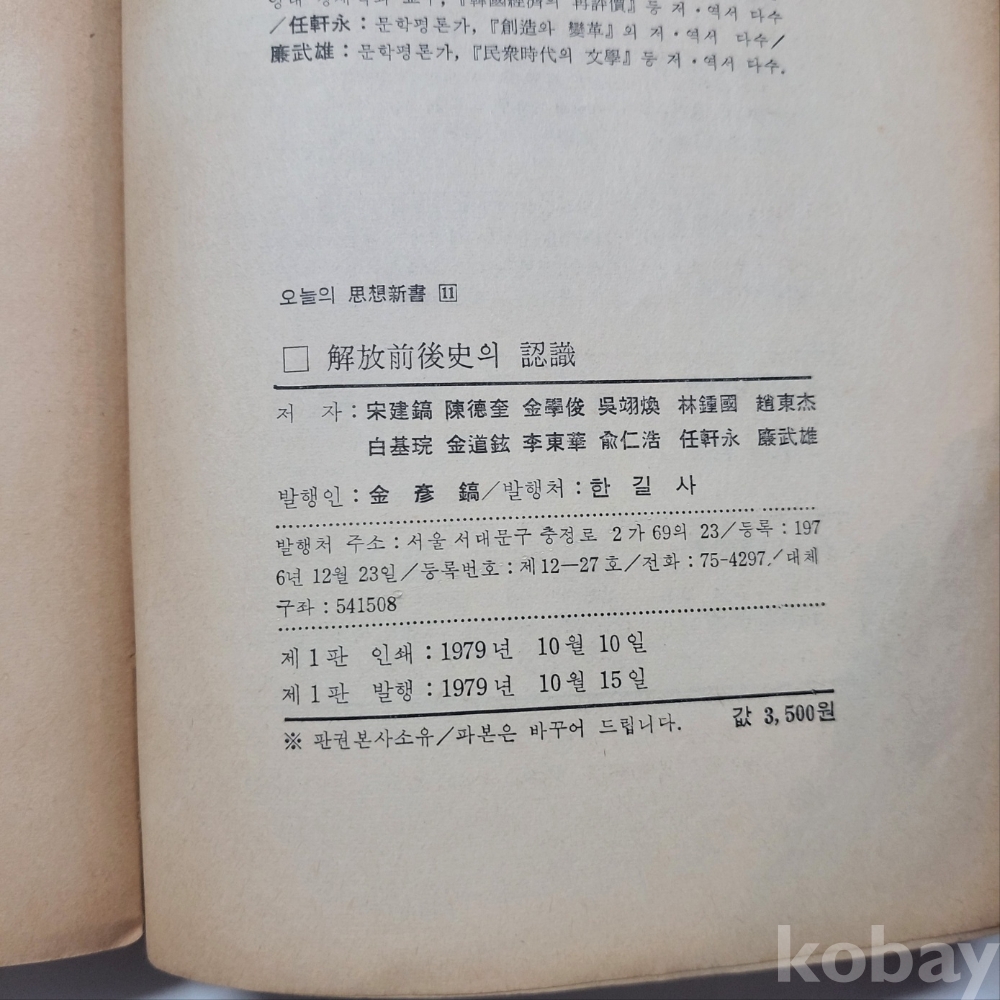[희귀본] 해방전후사의 인식 (오늘의 사상신서11) / 1979년 초판 : 낡은 감/중하급/서고T102