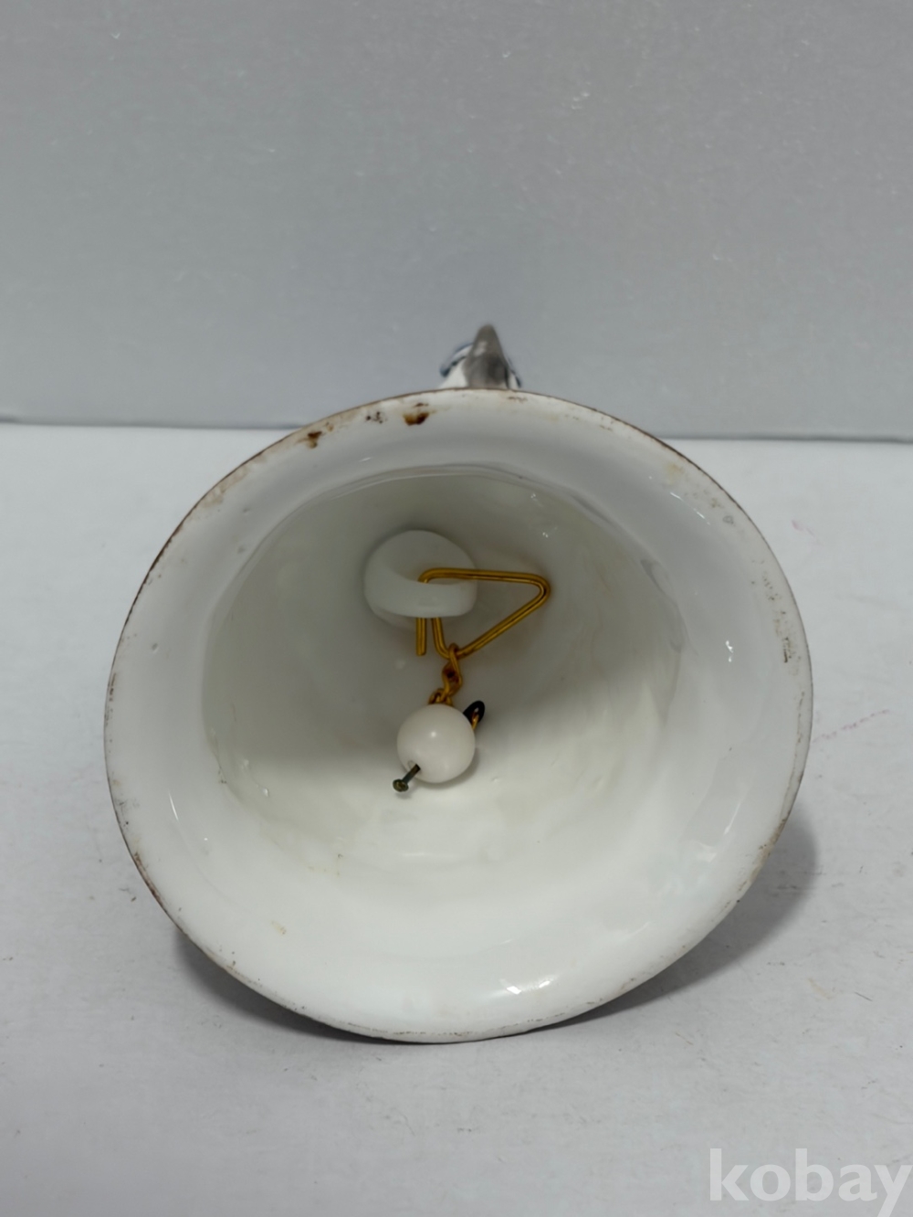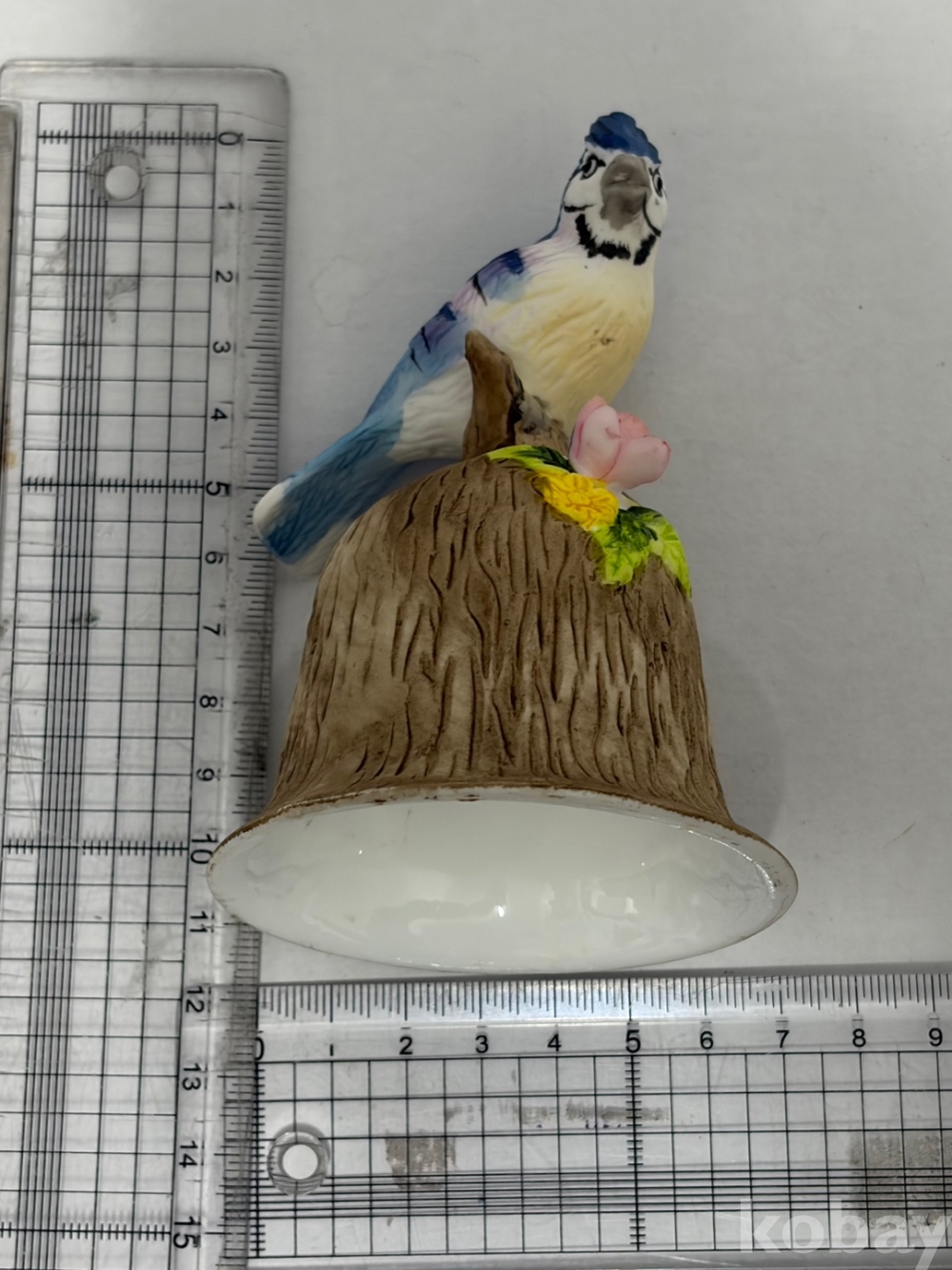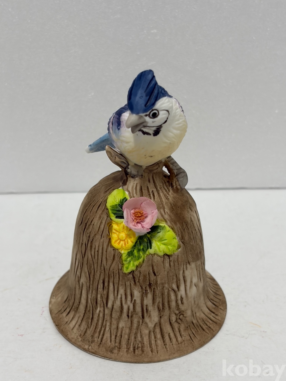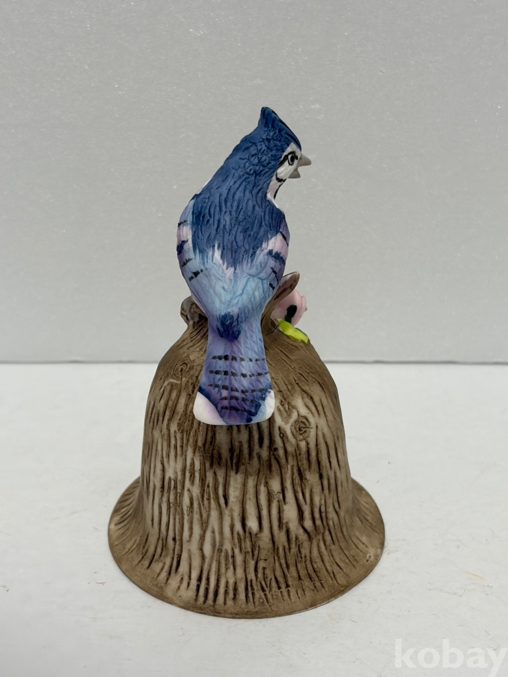 파란색 깃털을 가진 어치 새가 나무 밑동 모양의 종 위에 앉아있는 도자기 종입니다.