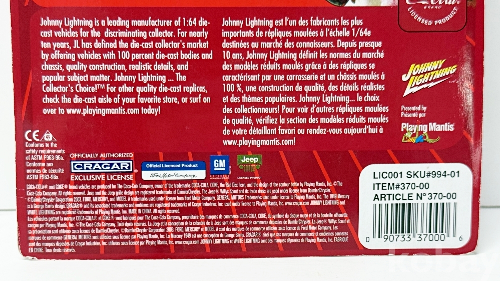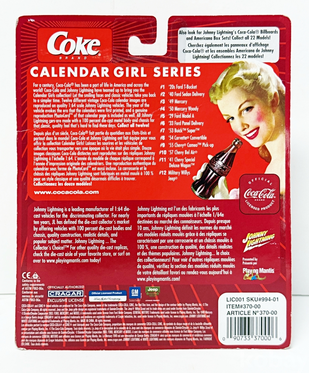 조니 라이트닝에서 제작한 '코카콜라 캘린더 걸 시리즈' 다이캐스트로 '20s Ford T-Bucket 모델 (1/64 스케일)이 들어있다. 보너스 캘린더 포토카드가 포함되어 있다. | ||