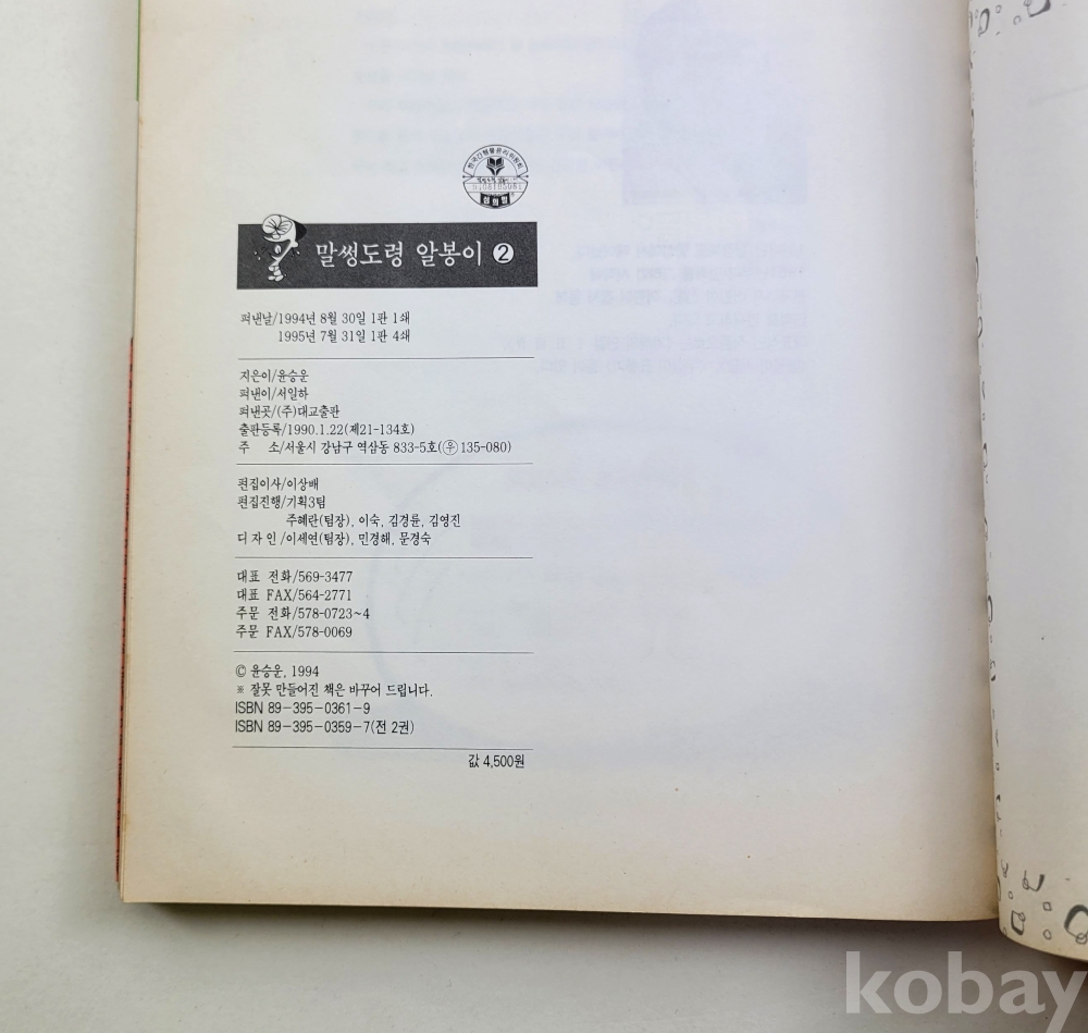물 품 명 | 윤승운 / 말썽도령 알봉이(2) / 눈높이명랑만화 / 1995년 / 대교출판 |