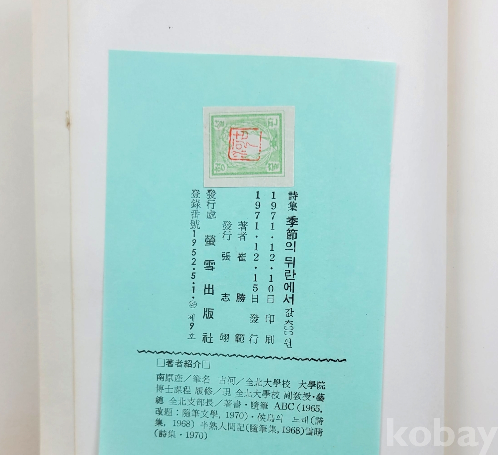 물 품 명 | 최승범 / 계절의 뒤란에서 / 1971년 초판 / 형설출판사 |