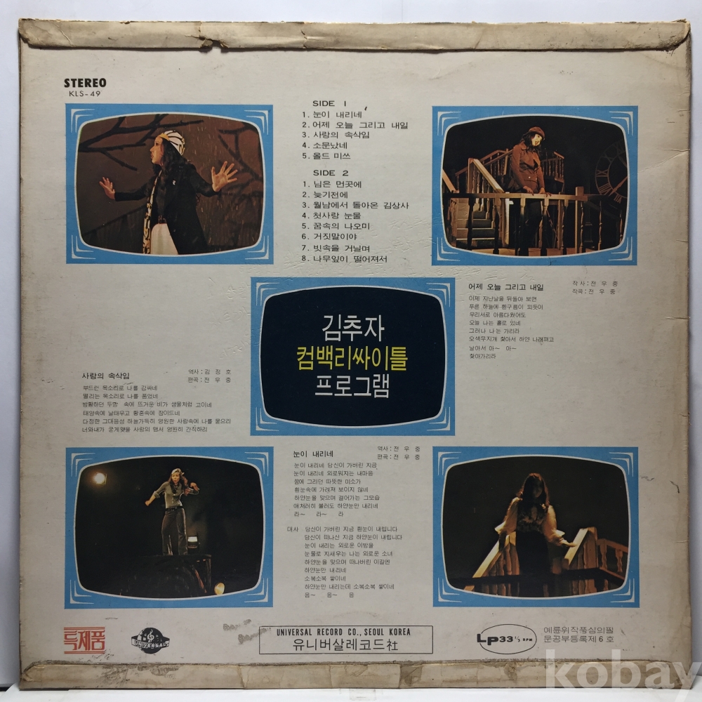 LP 82,400-55 김추자 리싸이틀 - 눈이 내리네/ 님은 먼곳에 자켓 EX 알판 EX 72 년 국내반