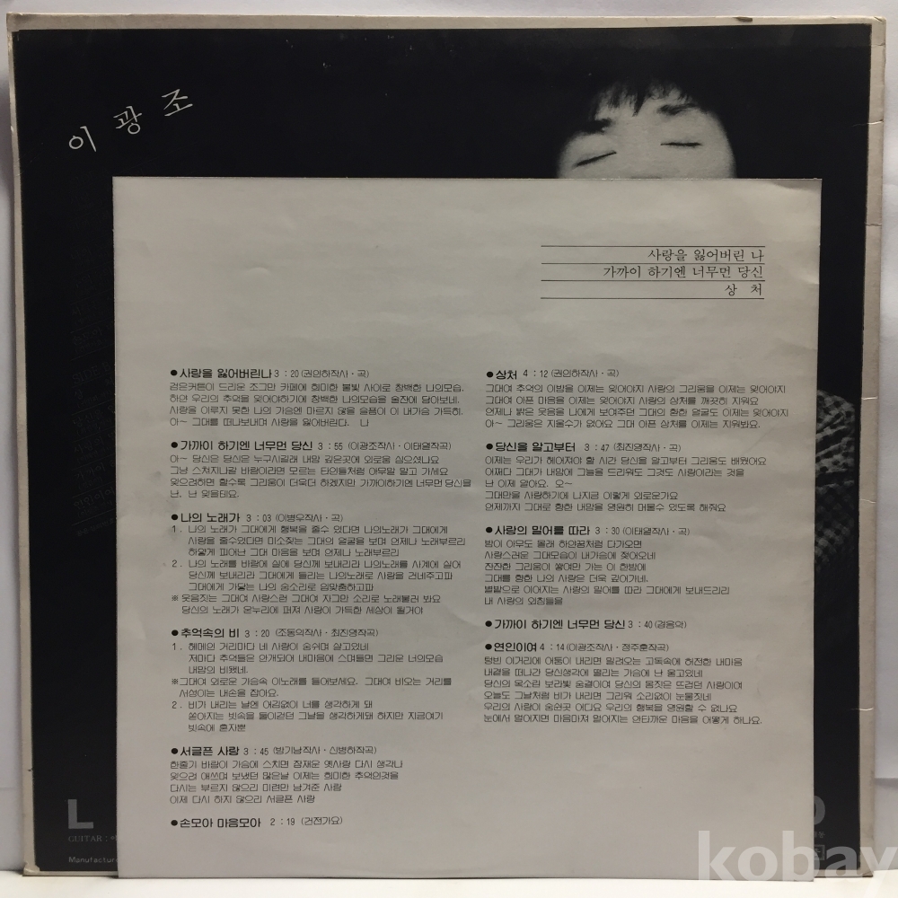 | 자켓상태 | EX : 약간의 마모, 모서리 찢김 존재 | 음반상태 | VG : 생활 기스 다수, 가벼운 노이즈 존재 | 발매정보 | 알수없음 | 가사지여부 | 무 |