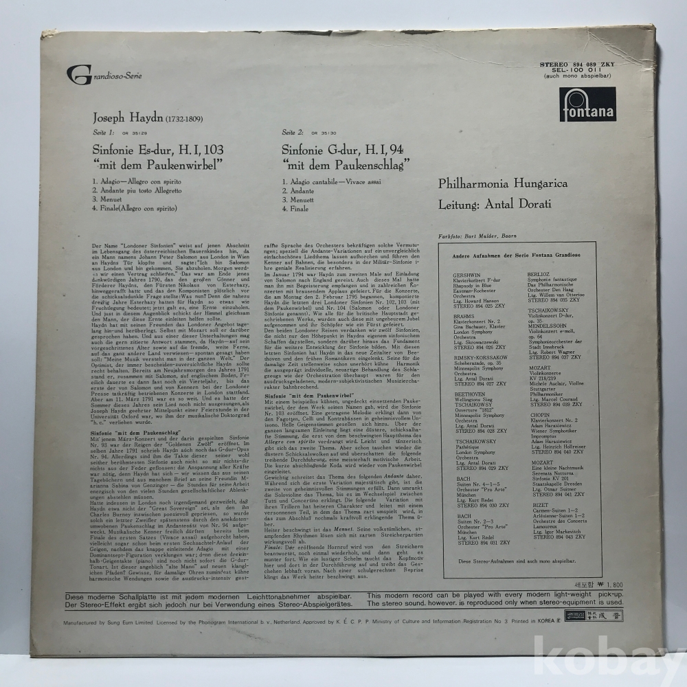 LP 29,300-160 Haydn Sinfonie Nr.103 - Antal Dorati . 71 성음 자켓 EX 알판 EX