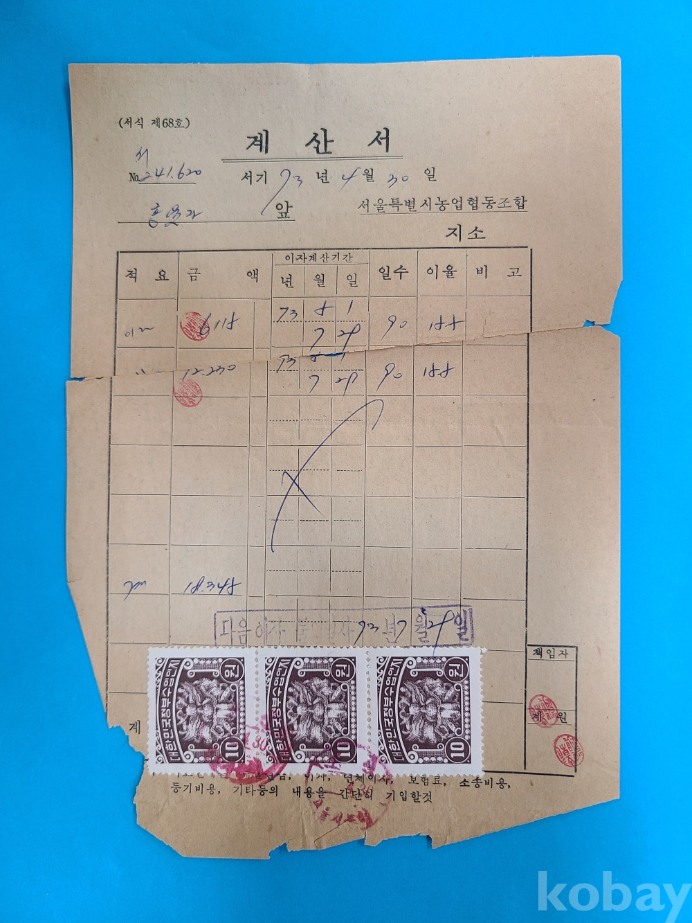 1973년 서울특별시농업협동조합 계산서(수입인지 3매첩부)