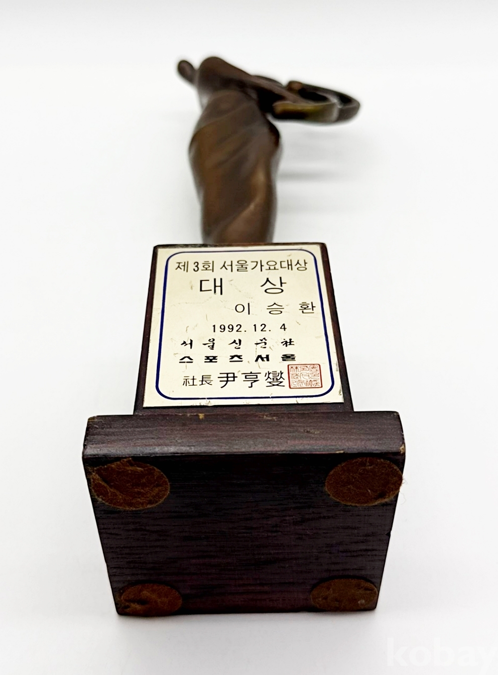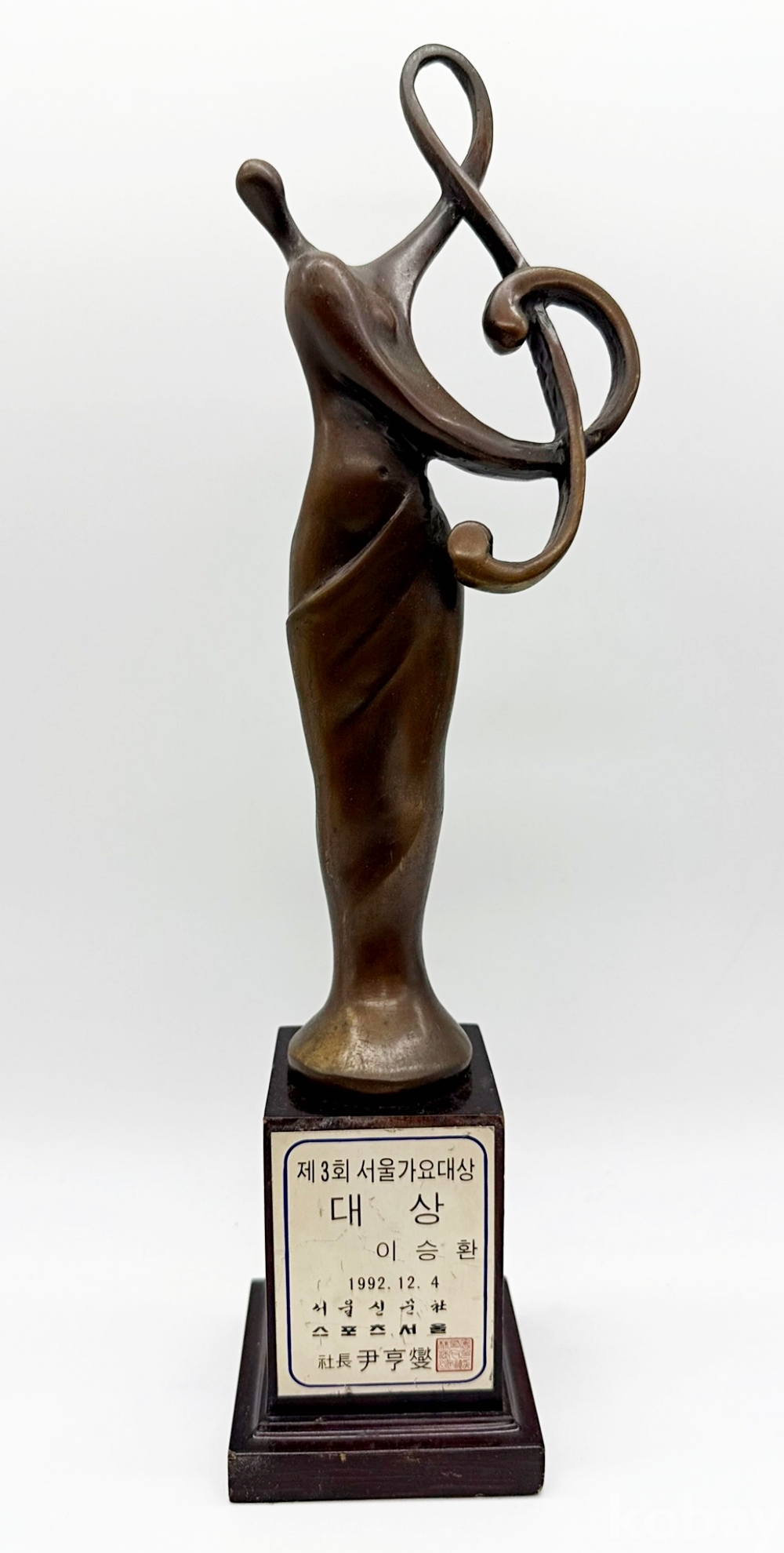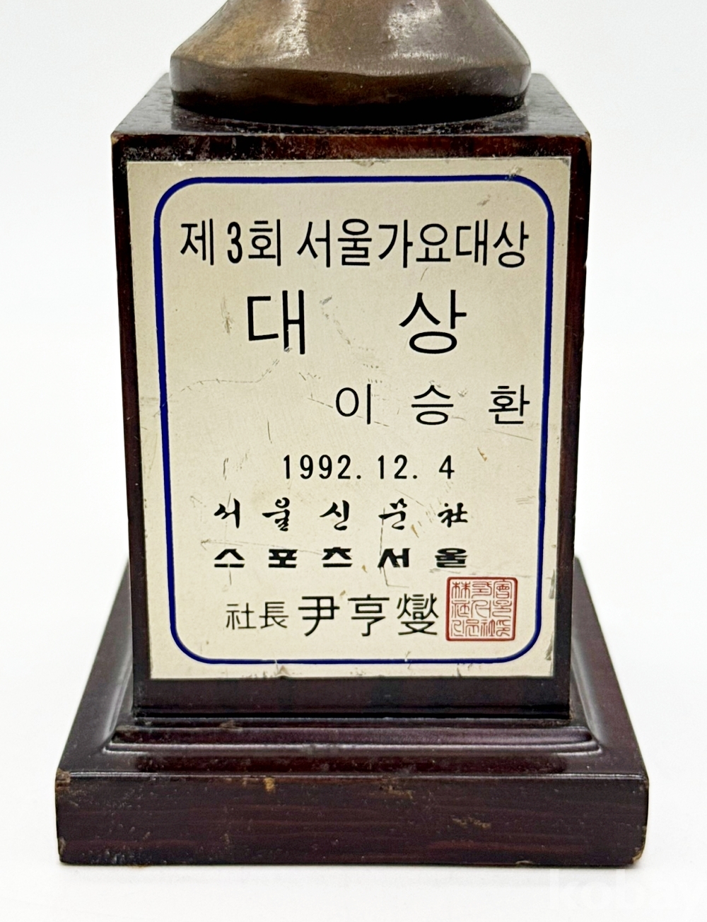 상품설명 | 1992년 서울신문사, 스포츠 서울에서 주최한 제3회 서울가요대상에서 가수 이승환이 수상한 '대상' 트로피이다. | ||