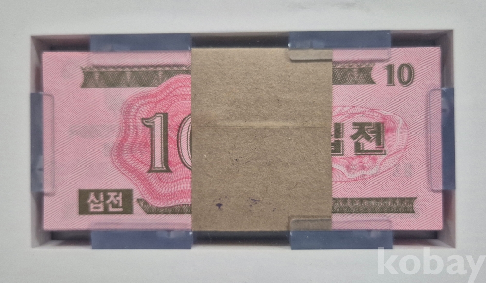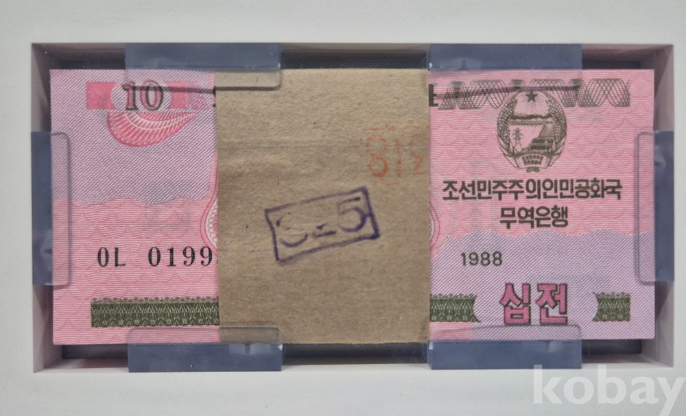 - 1982년 조선민주주의인민공화국 무역은행에서 발행한 외화와바꾼돈표 10전 100장 연번 미사용 지폐 다발 그레이딩 지폐 입니다.