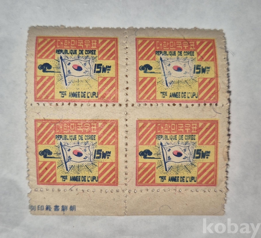 1949년 발행된 '만국우편연합 창설75주년 기념우표' 15원 4매 명판부 블럭 입니다.