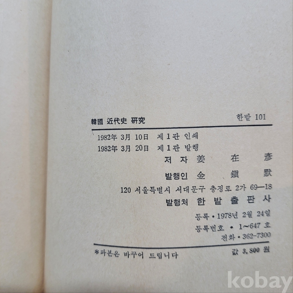[초판본] 한국근대사연구 (한밭출판사. 1982년 초판) ; 중급/서고t307