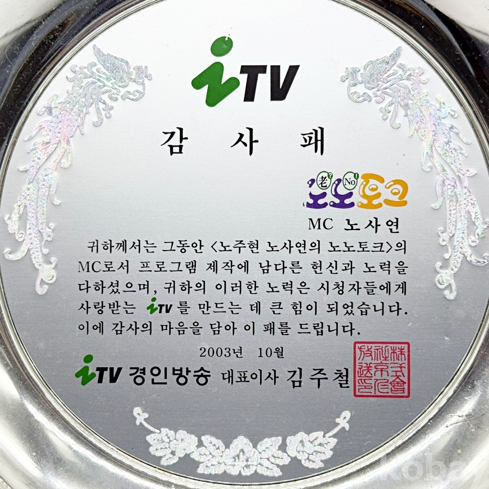 상품명 | 2003년 iTV 경인방송 <노주현 노사연의 노노토크> 'MC 노사연' 감사패 | ||
