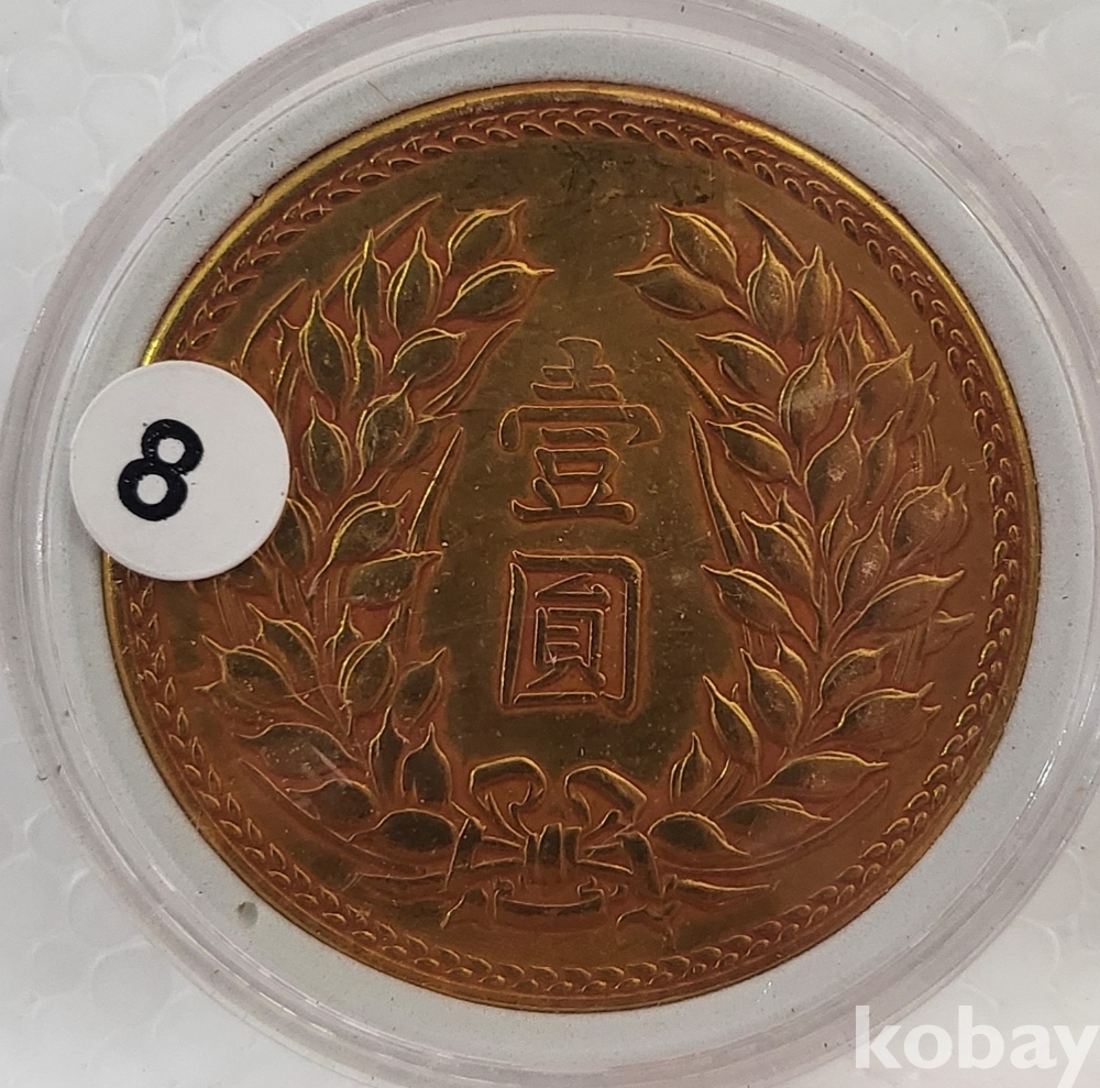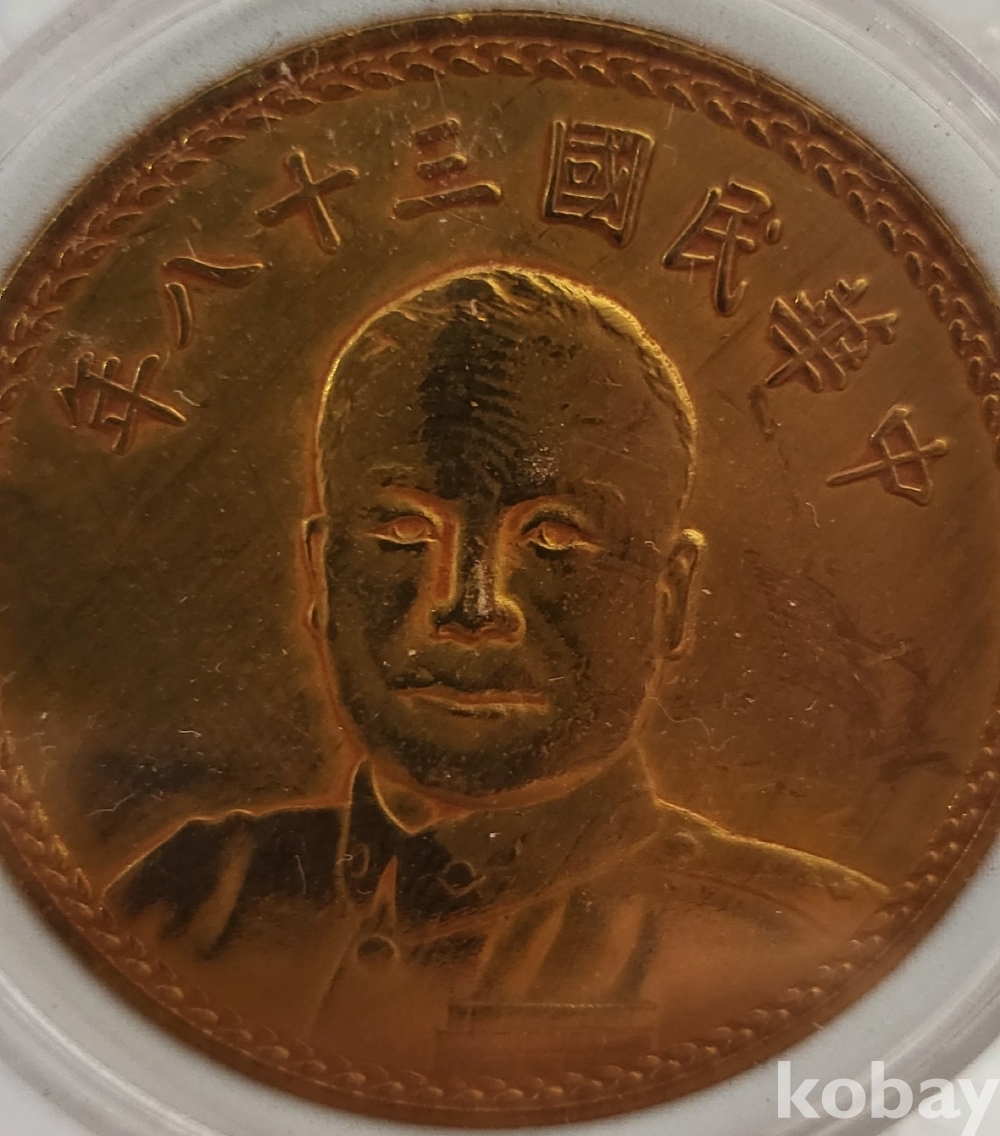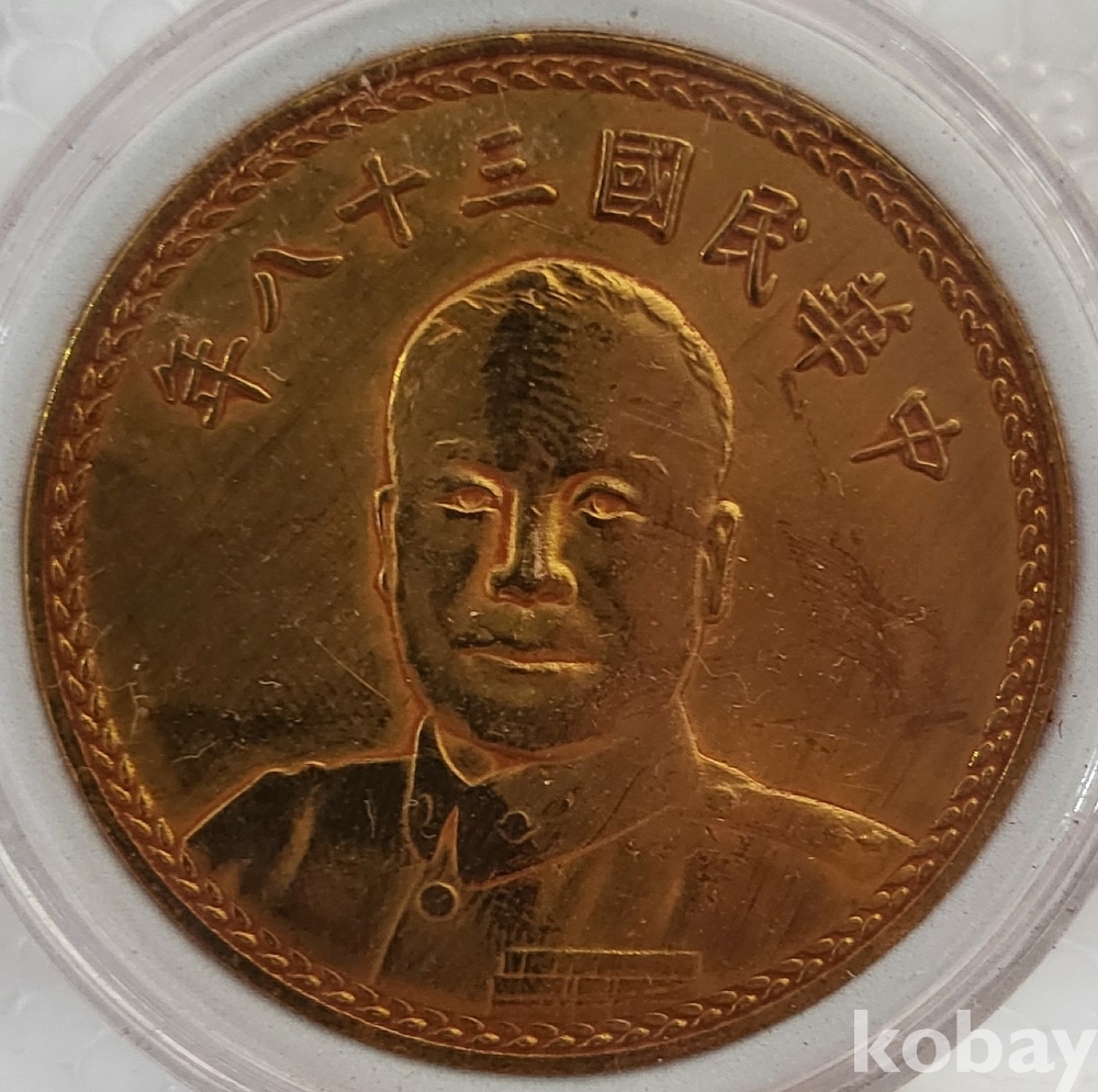 중화민국 38년 발행된 액면가 일원 금색 주화입니다.