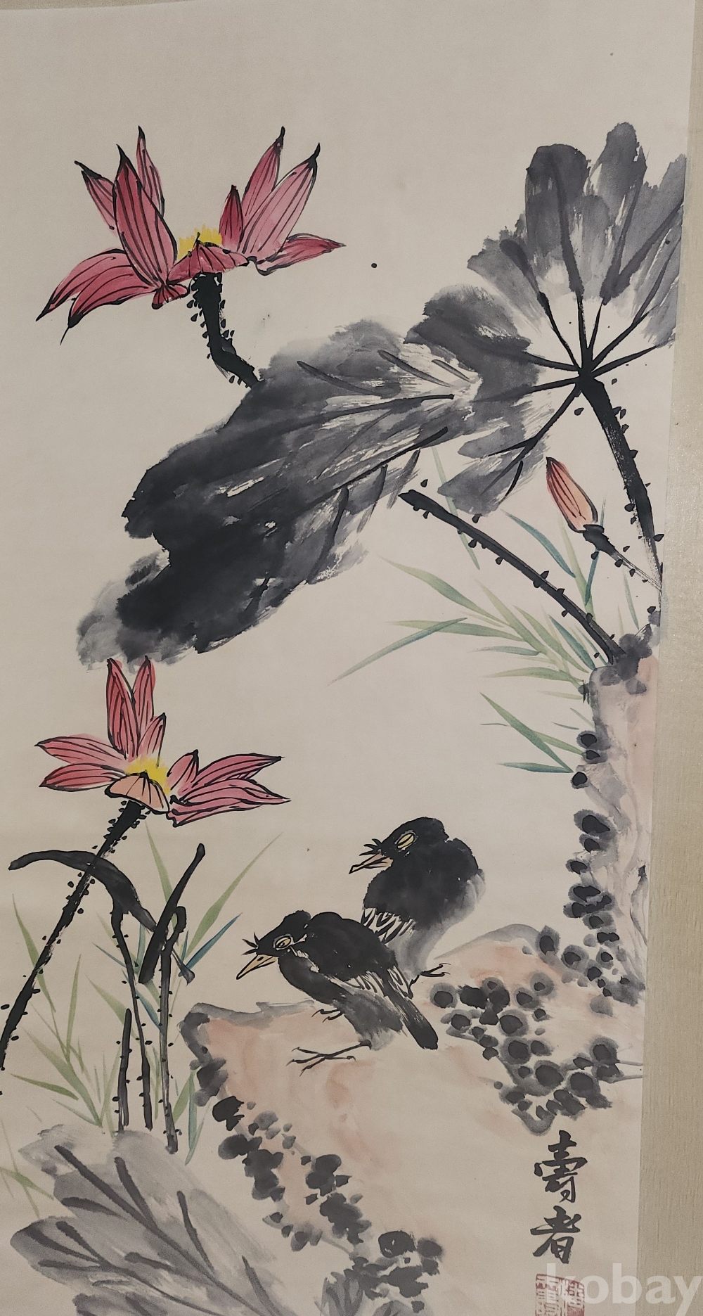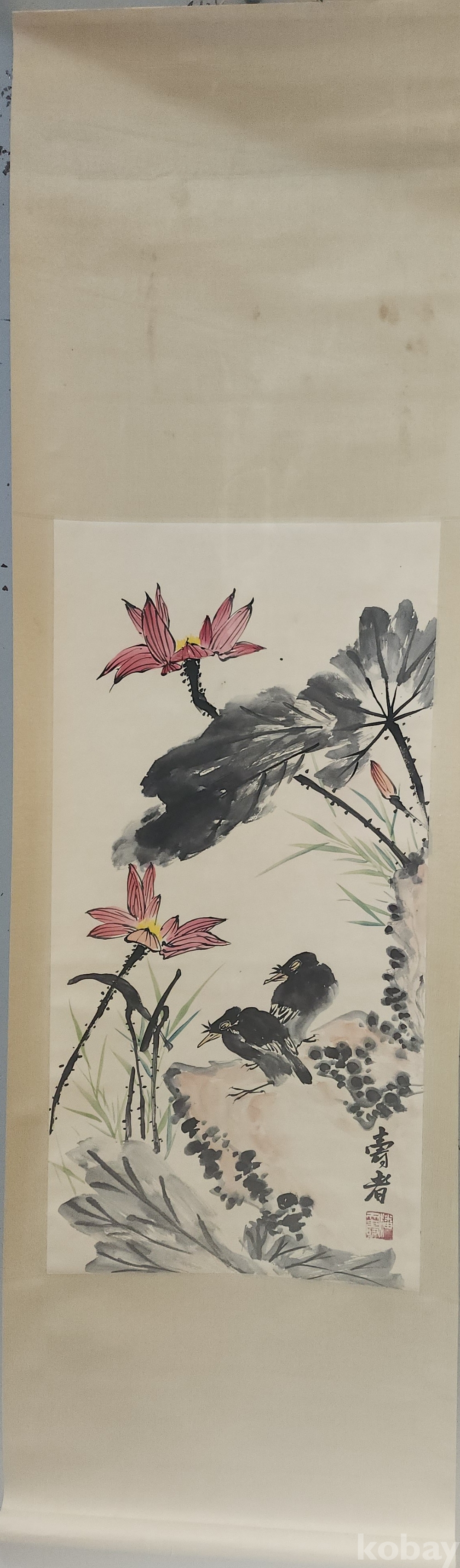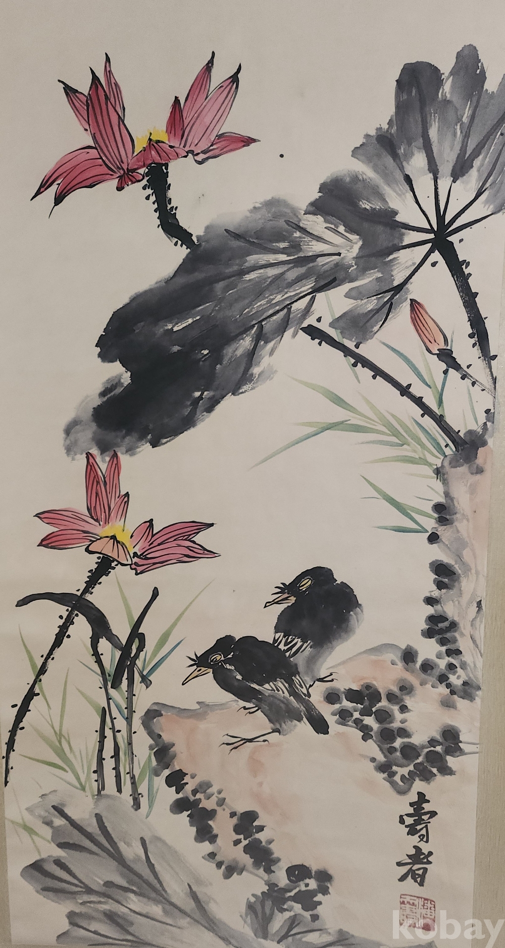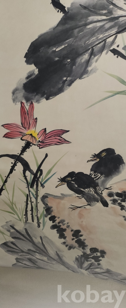 중국화가 반천수 수결이 보이는 연꽃과 새그림 그림 큰 족자입니다,