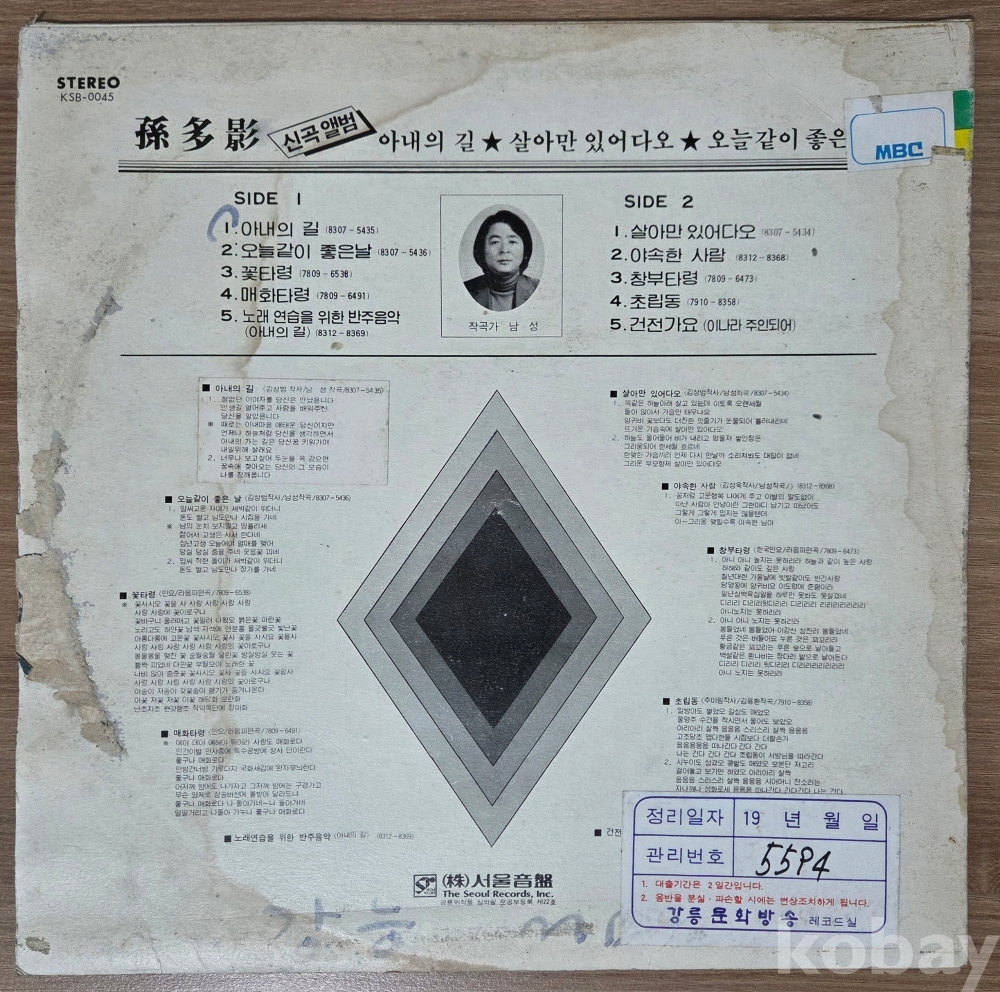 | 자켓상태 | P : 물에 젖거나 심한 훼손 | 음반상태 | VG : 생활 기스 다수, 가벼운 노이즈 존재 | 발매정보 | 알수없음 | 가사지여부 | 무 |