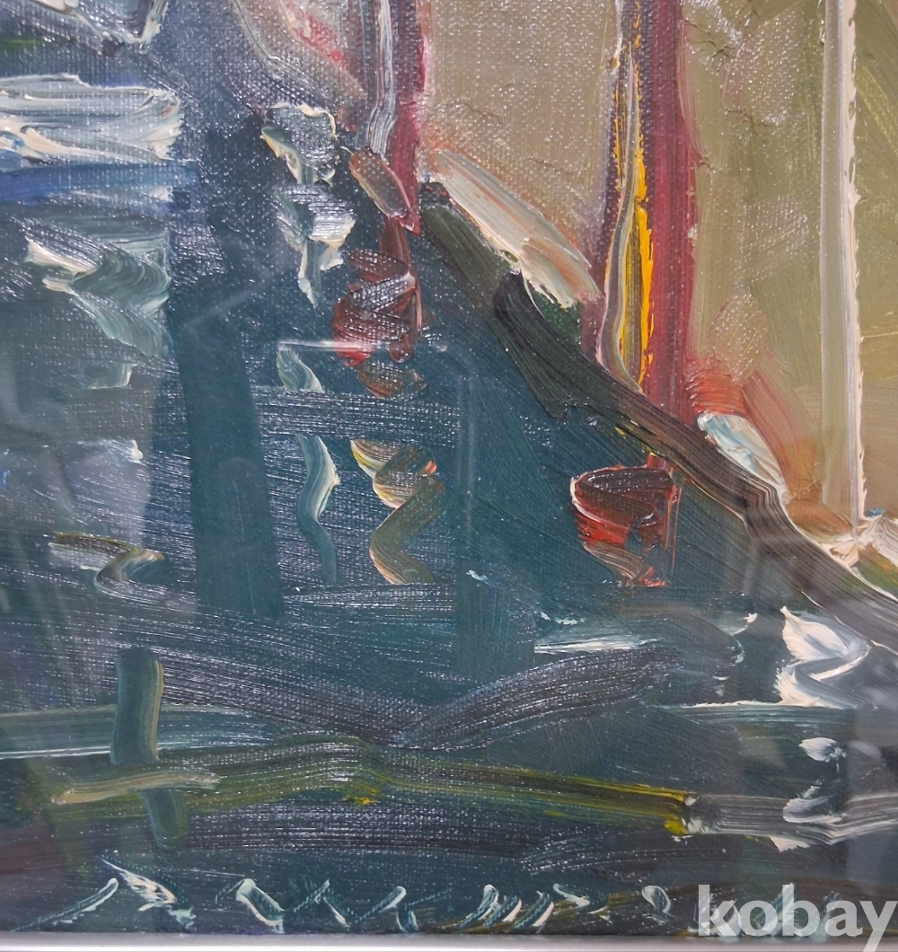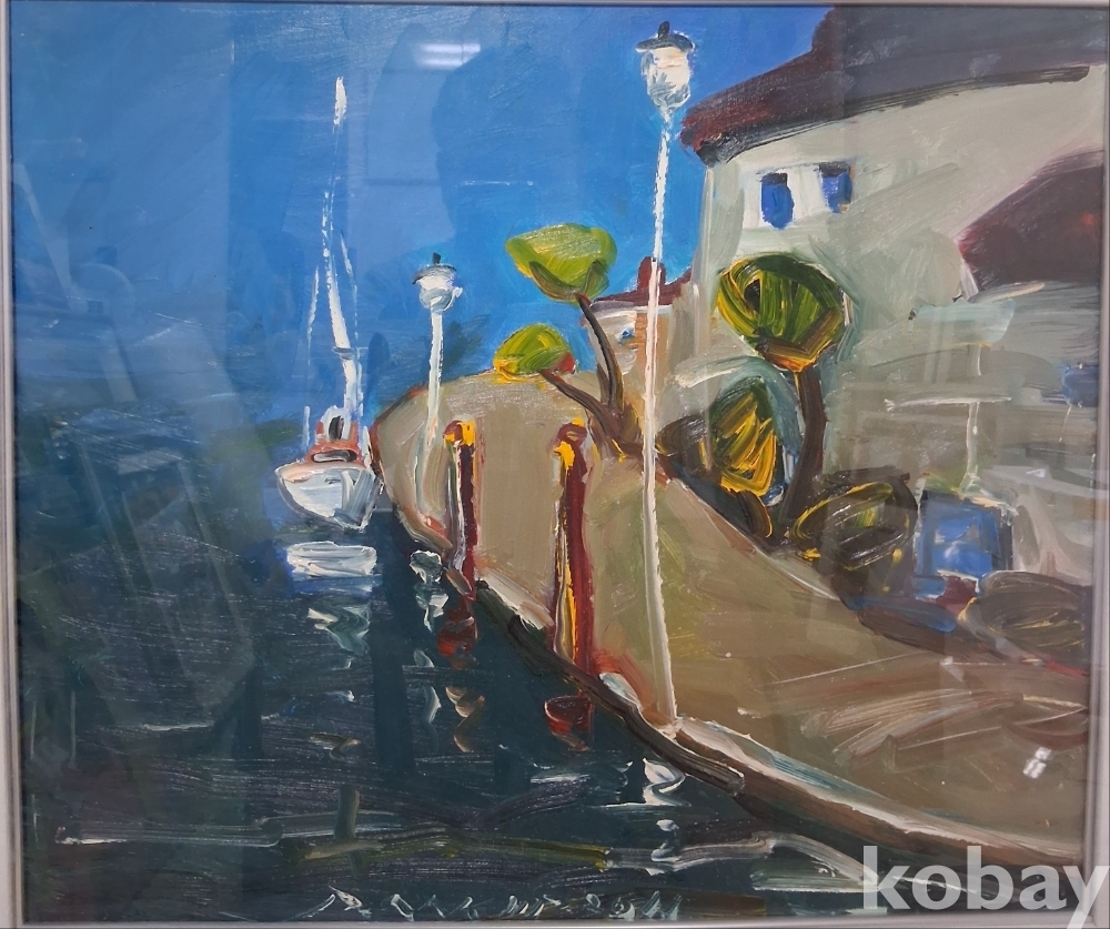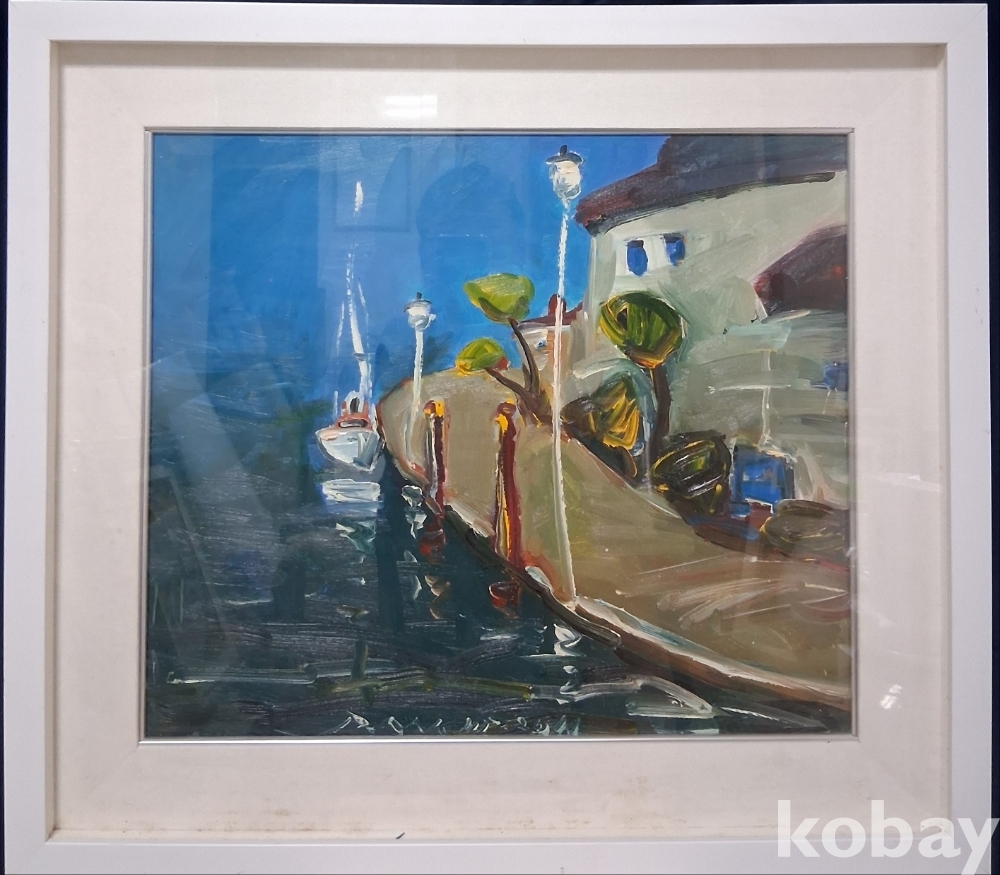 본 작품은 부두를 따라 이어지는 수변 공간을 사선 구도로 구성하고 있으며, 건물과 가로등, 수면의 반사가 화면 깊이를 형성한다. 비교적 두터운 붓질과 간결한 색면 처리로 구조가 드러나며, 하늘과 물의 색 대비가 공간감을 강조한다. 전체적으로 일상적인 풍경을 단순화된 형태로 정리한 회화 작품이다.