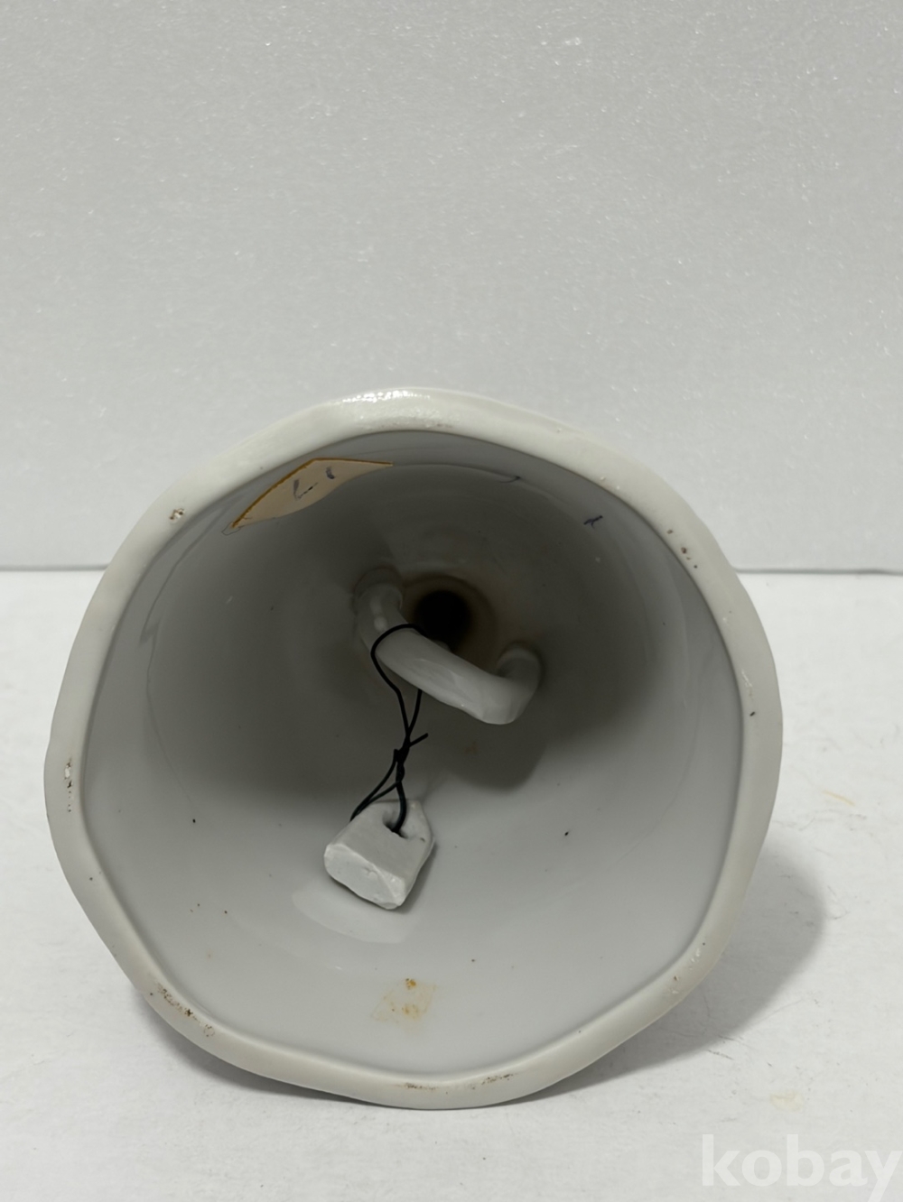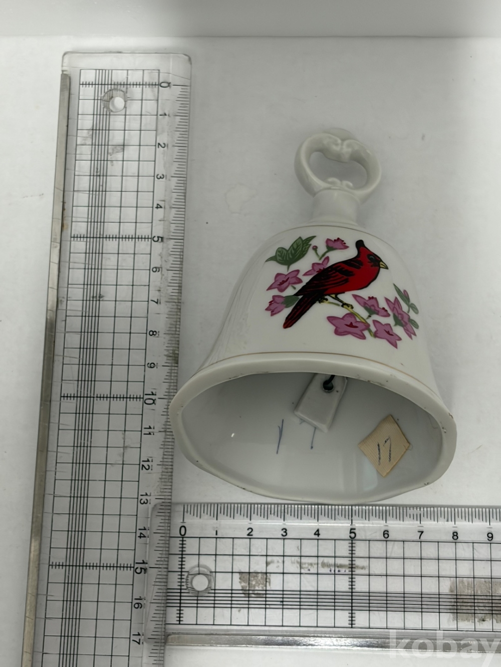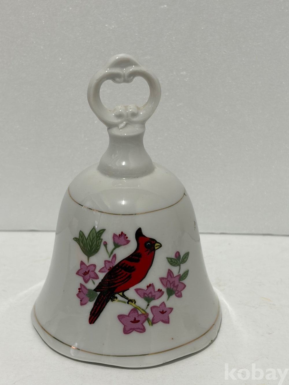빨간 홍관조와 분홍색 꽃 장식이 있는 도자기 종입니다.