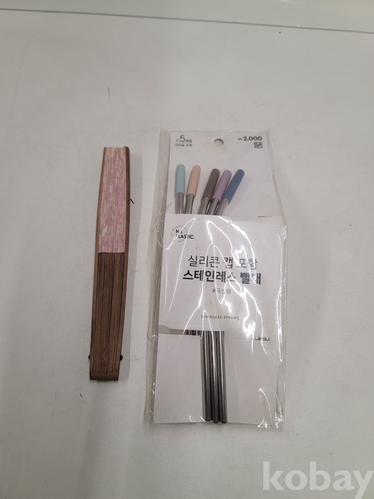 [*천원행복*] 12-0593 스테인레스 빨대(5개 미사용), 휴대용 부채 1개