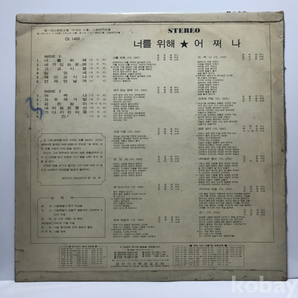 LP 160-159 장욱제 - 너를 위해/ 김상희 - 어쩌나 / 이성해 타미 방주연 73 오아시스 자켓 VG+ 알판 VG+