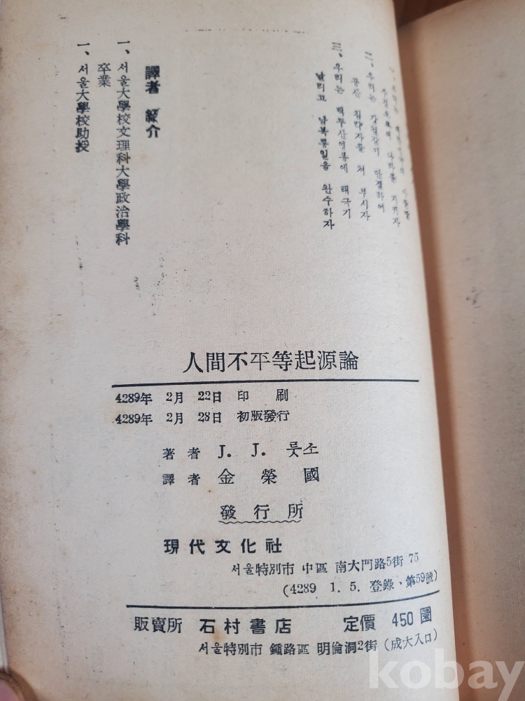 1. 인간불평등기원론, 룻소(이영국 역), 현대문화사, 1956년, 241쪽, 상태 상, 사진 참조
