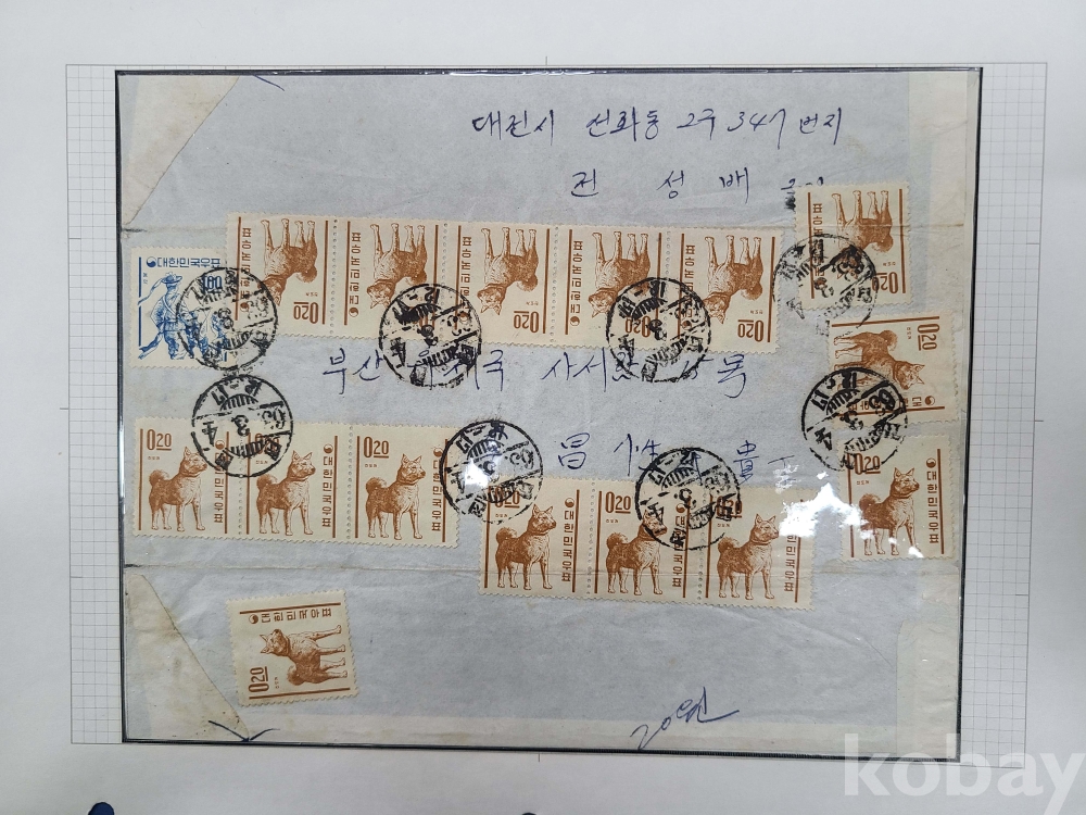 63년 새원화외산백지 0.20전 진돗개 15매,1원 농약 첩부 실체,대전,63.3.4,봉투는 펼친 상태임