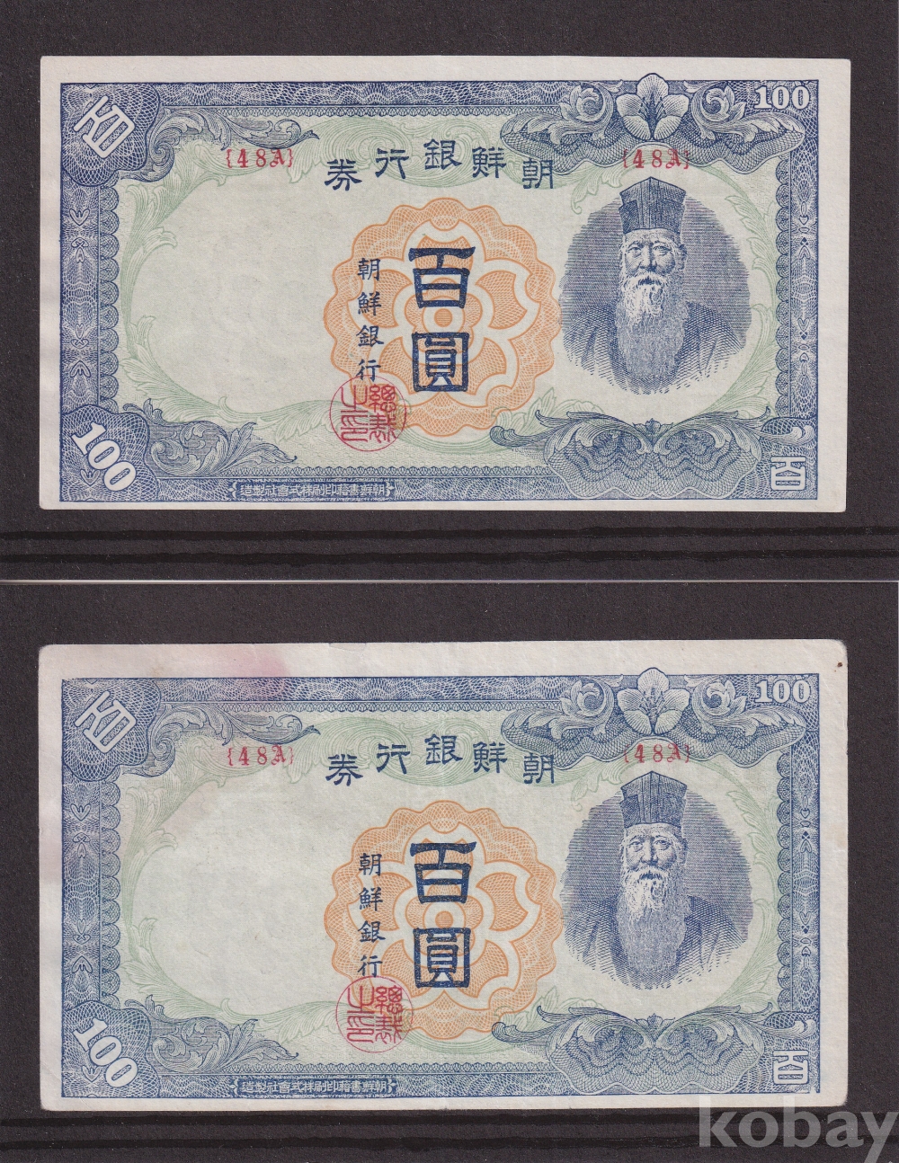 - 조선은행 1947년 무백원 판번호 48A 사용제 지폐 - 2장 일괄