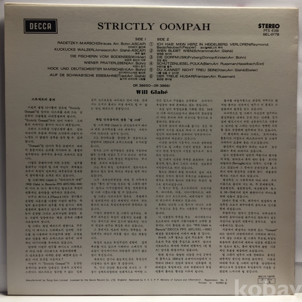 LP 250-272 Strictly Oompah - 스티릭트리 움파 - Will Glahe 73 성음 자켓 EX+ 알판 NM
