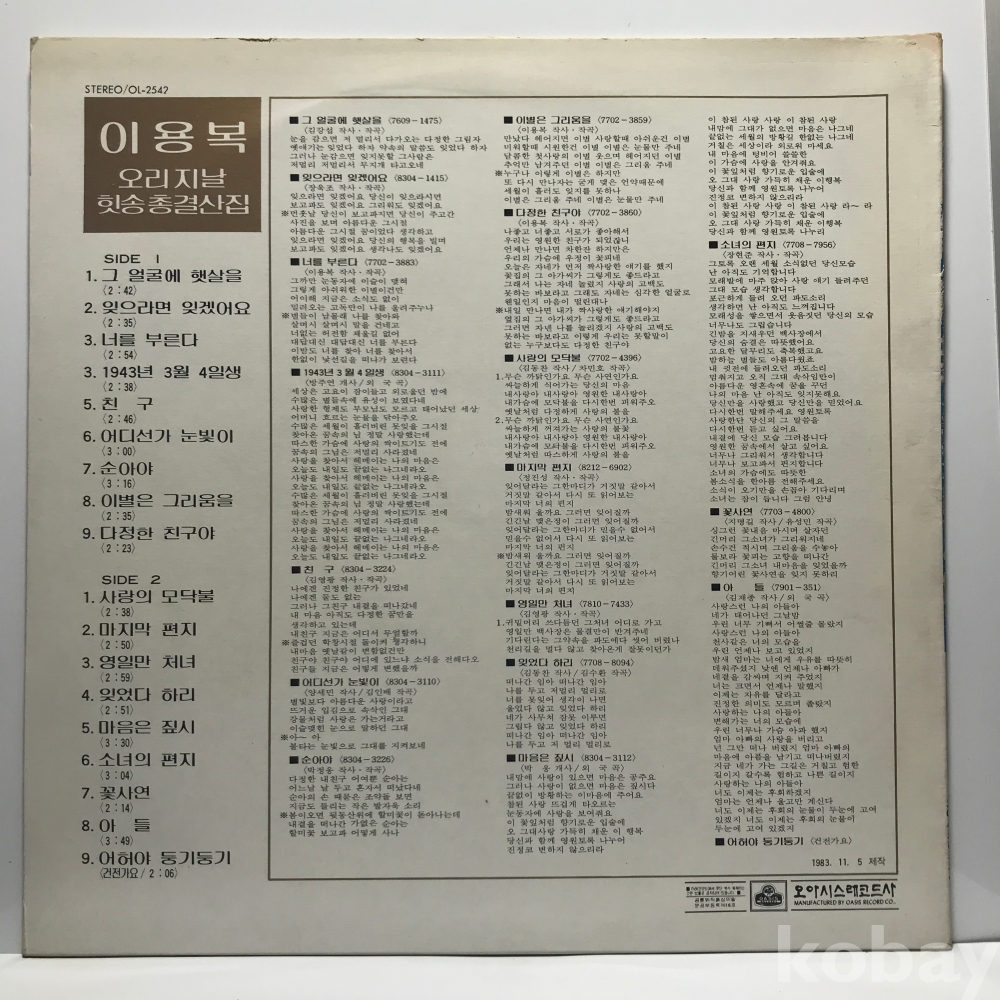 LP 13,000-32 이용복 오리지날 힛송총결산집 - 그 얼굴에 햇살을 83 오아시스 자켓 EX 알판 EX+