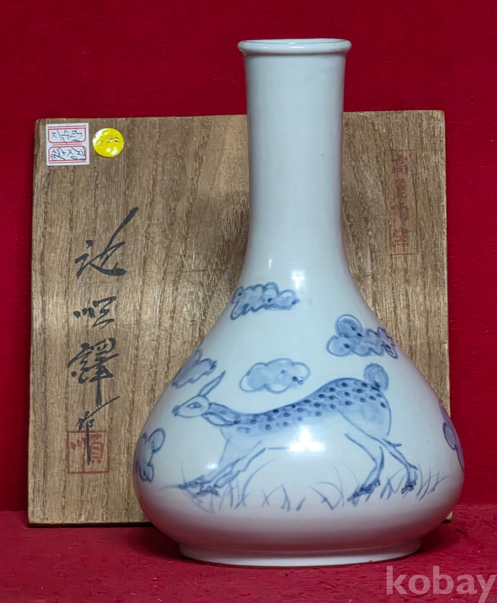 "인간문화재"도암 지순탁 청화백자 장생 주병(진품보증)(작품상태최상급)(수결박스완비)