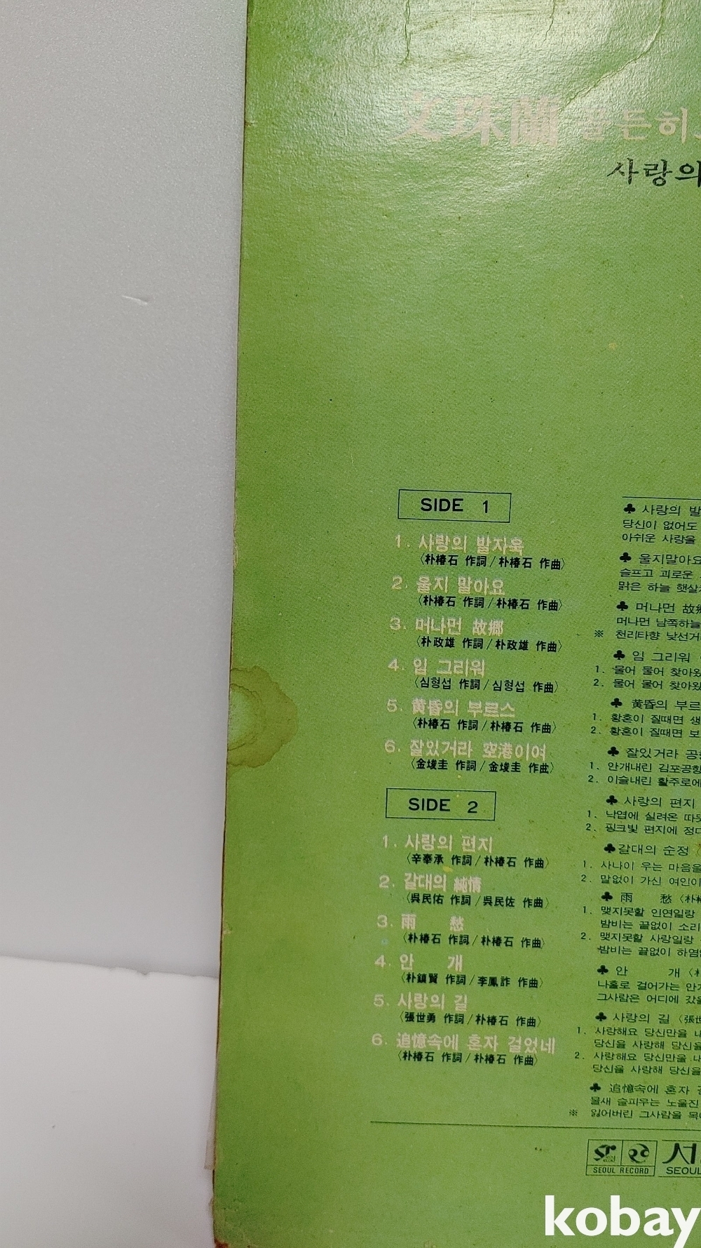 | 자켓상태 | VG : 주름, 접힘, 모서리 찢김 다수 | 음반상태 | VG : 생활 기스 다수, 가벼운 노이즈 존재 | 발매정보 | 초반 | 가사지여부 | 무 |