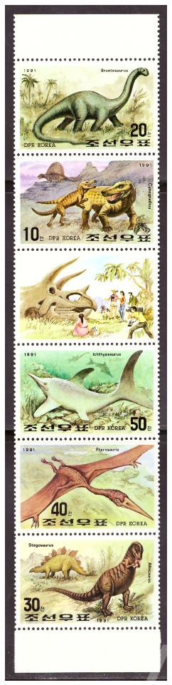 (공룡) 북한 1991.5.21 중생대동물 strips of 5+label MNH