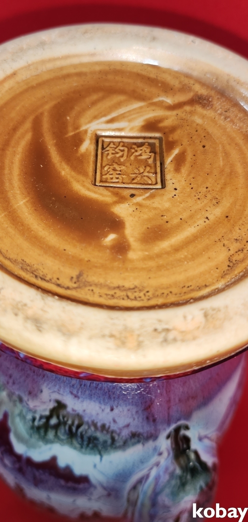 중국의 5대 명요인 균요( 鈞窯)관지 보이는 등나무와 공작새 문양 양귀달린 병입니다,