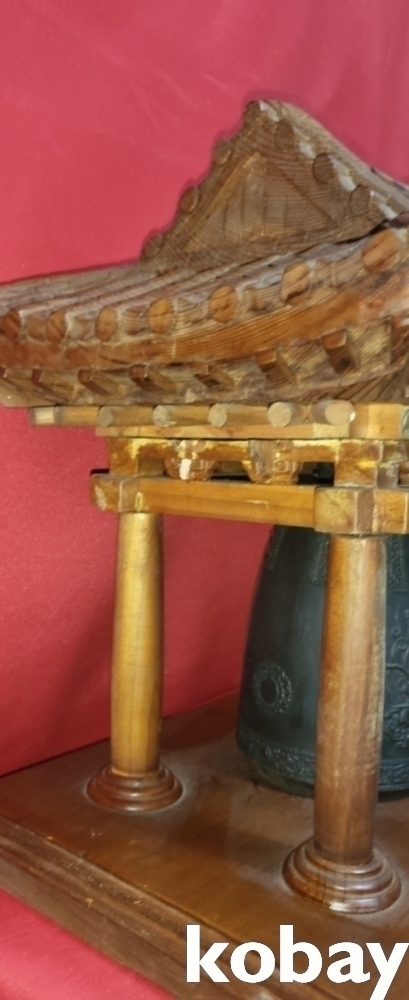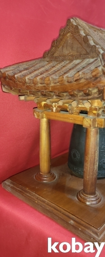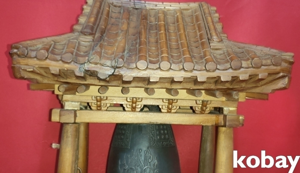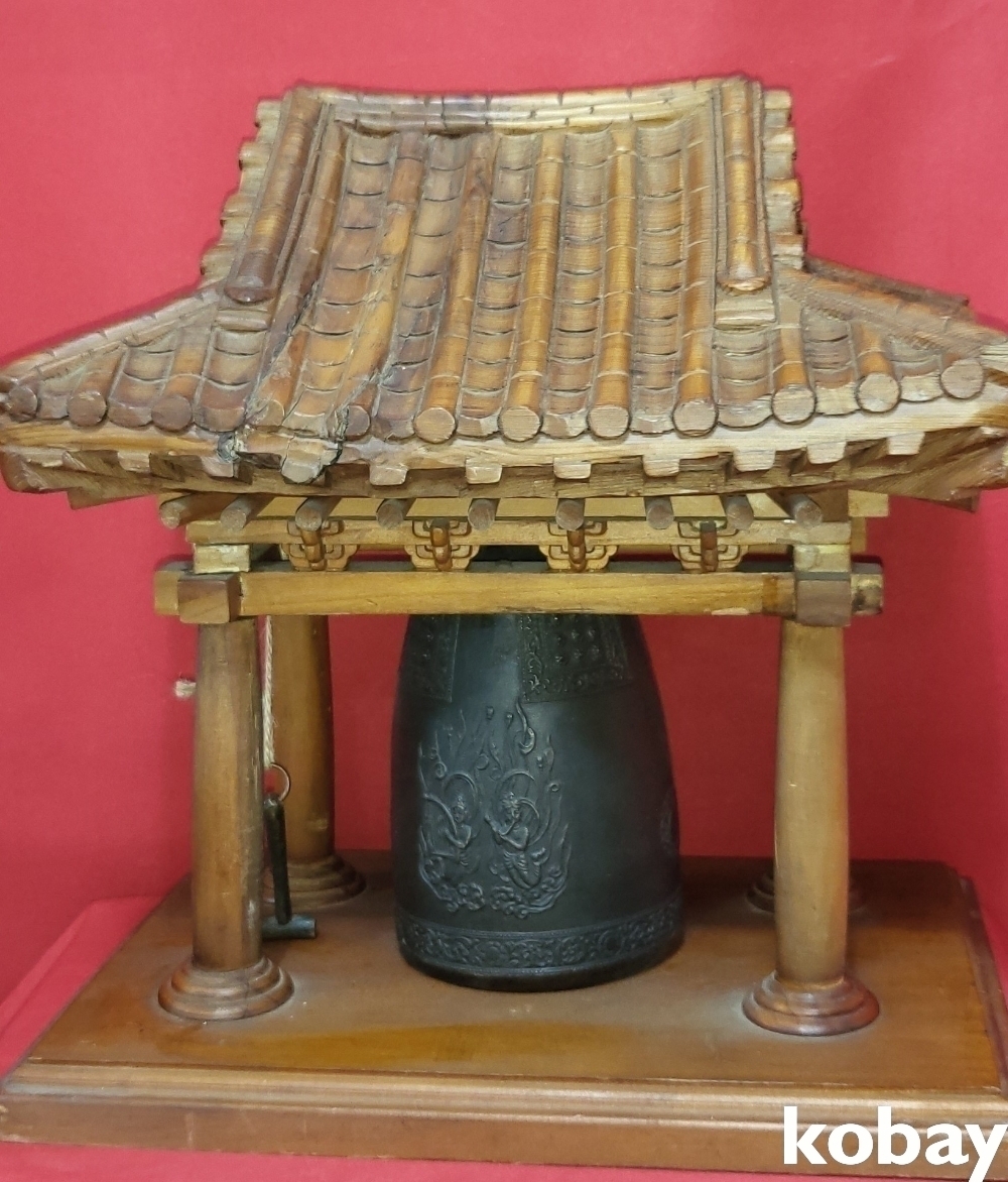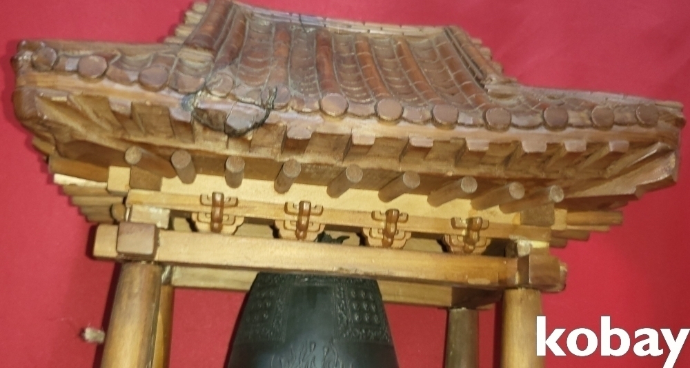 청동 비천상 문양의 종으로 외형은 나무로 완성된 기와 지붕 종각(鐘閣)입니다,
