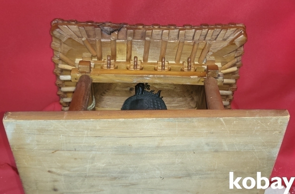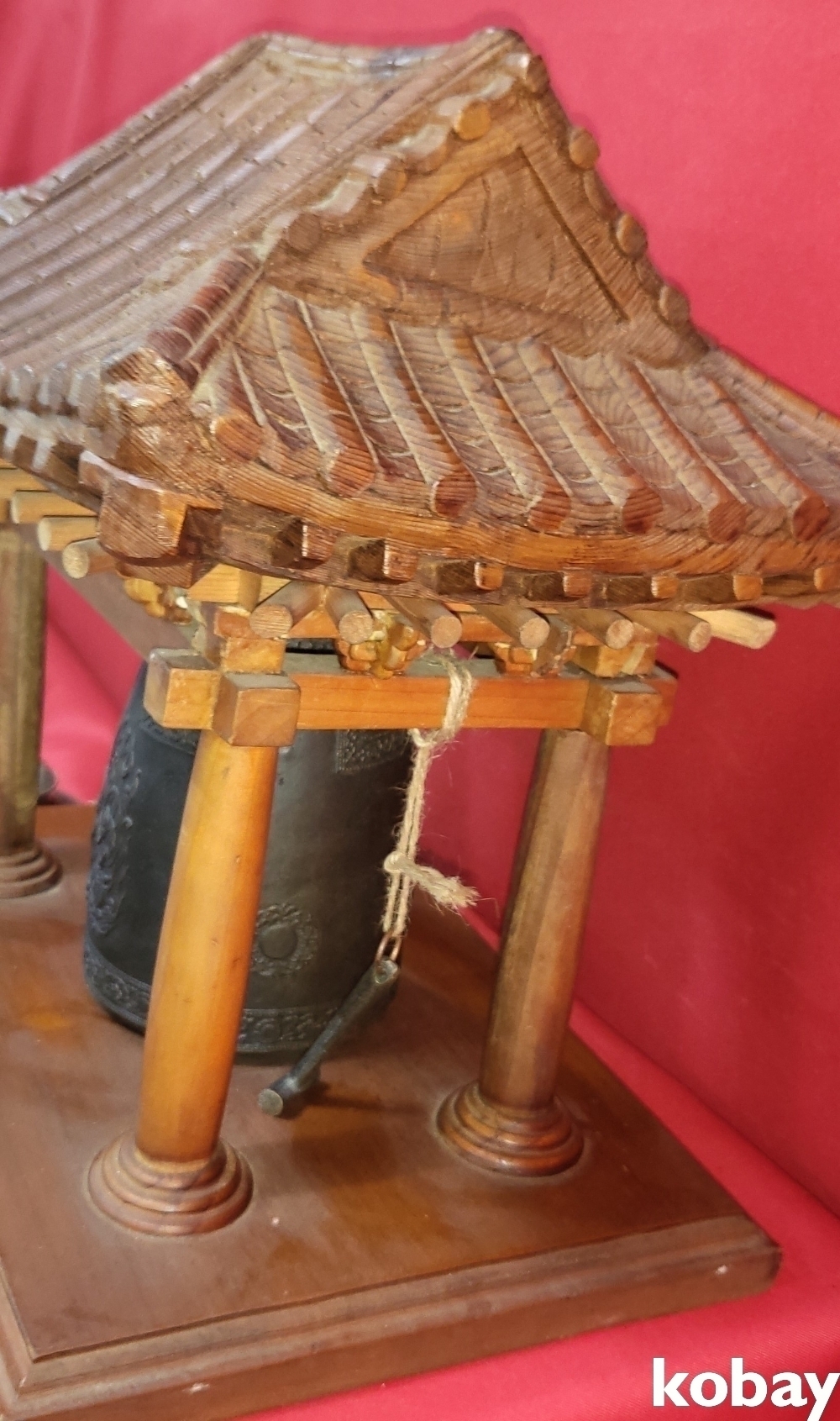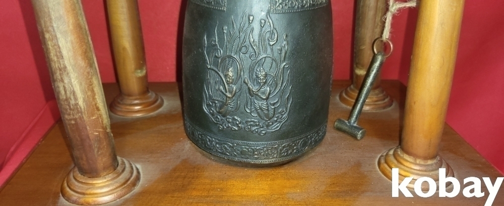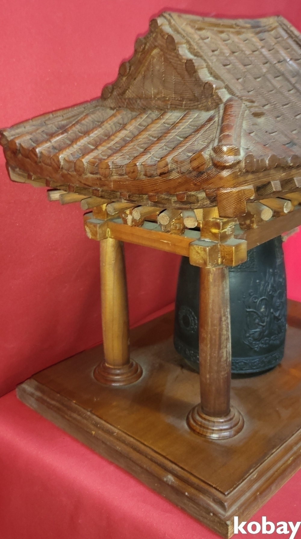 청동 비천상 문양의 종으로 외형은 나무로 완성된 기와 지붕 종각(鐘閣)입니다,