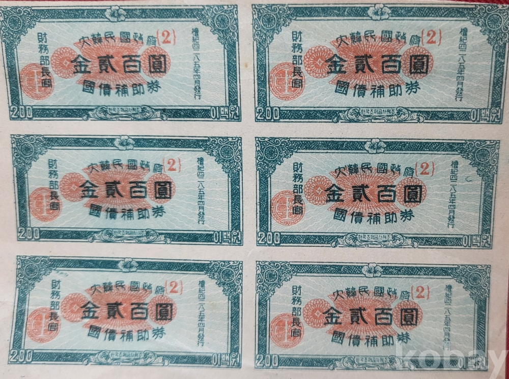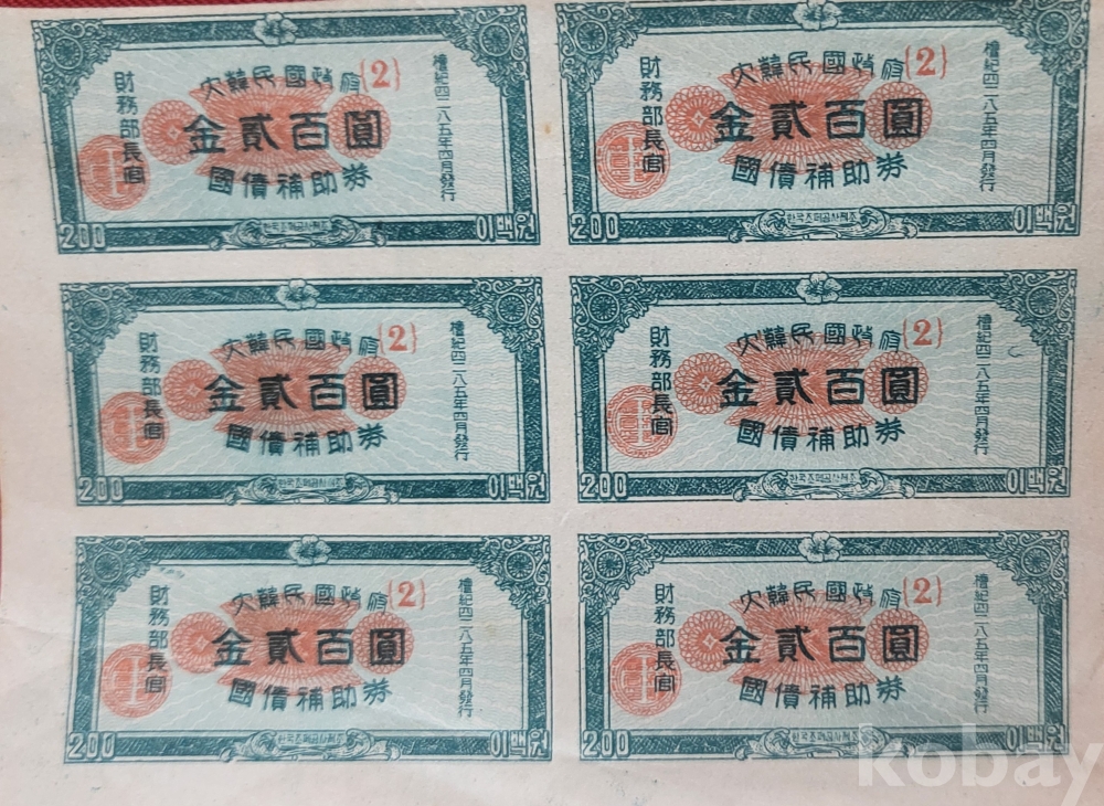 1952년( 단기4285년 ) 한국조폐공사 제조 재무부장관 발행한 이표채(利票債) 6장일괄입니다,
