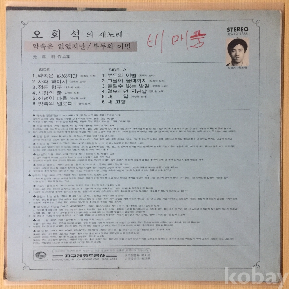 1. 약속은 없었지만 (오회석) 2. 사과해야지 (오회석) 3. 정든 항구 (오회석) 4. 사랑의 꿈 (김인순) 5. 산넘어 마을 (박상규) 6. 빗속의 멜로디 (이성애) | 1. 부두의 이별 (오회석) 2. 그날이 올때까지 (오회석) 3. 돌릴수 없는 발길 (오회석) 4. 철모르던 지난날 (김인순) 5. 내일 (박상규) 6. 내고향 |