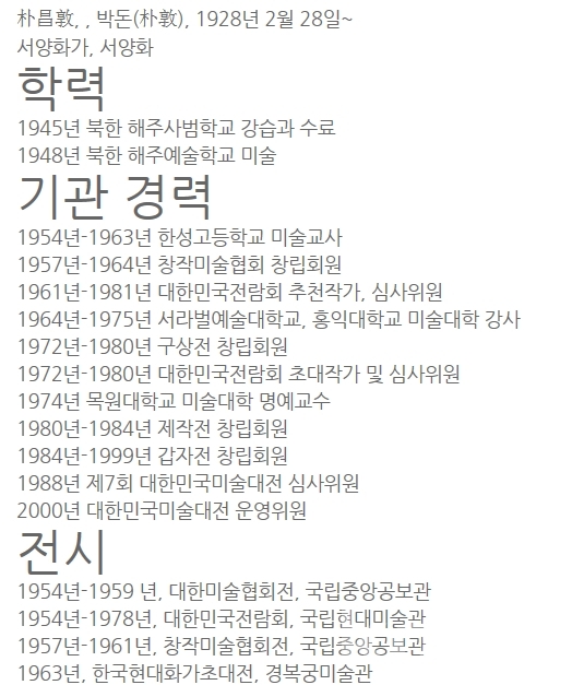 해주예술학교미술과(48), 개인전6(74-90),국전추천작가(61-72), 동초대작가.심사위원(73-), 현대미술초대전(83-90), 한국미술대상전, 창작미협전(57-63), 구상전(67-80), 한일교류전, 한중교류전, 현역작가100인전(73), 현대서양화대전(77), 한국현대미술전(Italy), 한국양화70년전(85), Salon85한국전은상(Paris), 한국현대미술어제와 오늘전, 서울미술대전, 기타창작전(81-83), 갑자전(84)