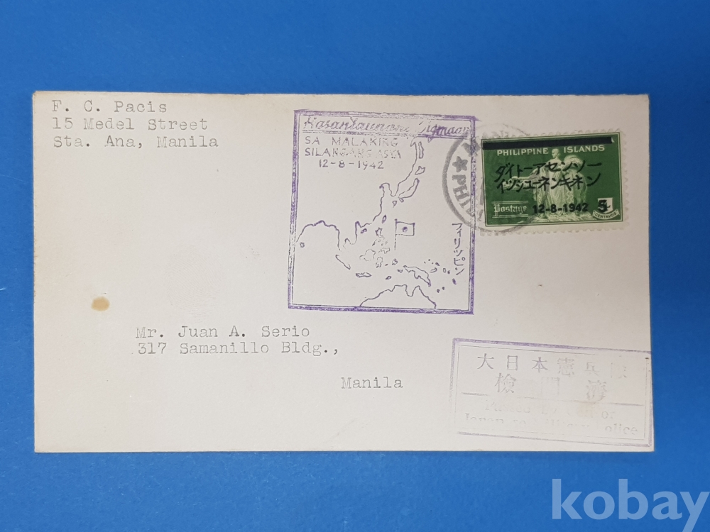 **** 필리핀 마닐라, 일본군 검열 소인분/1942.12.8/우표1매 첩부