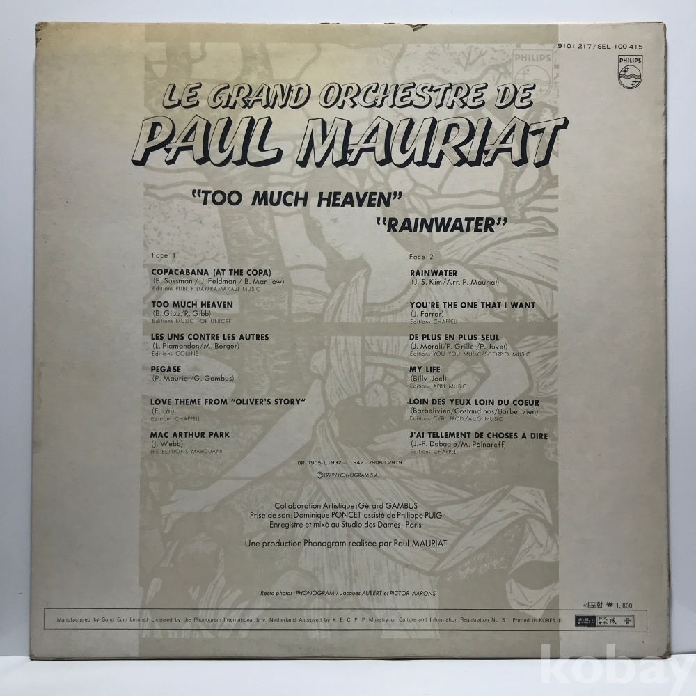 LP 300-31 Paul Mauriat - Too Much Heaven Rainwater 자켓 EX 알판 EX+ 79 년 국내
