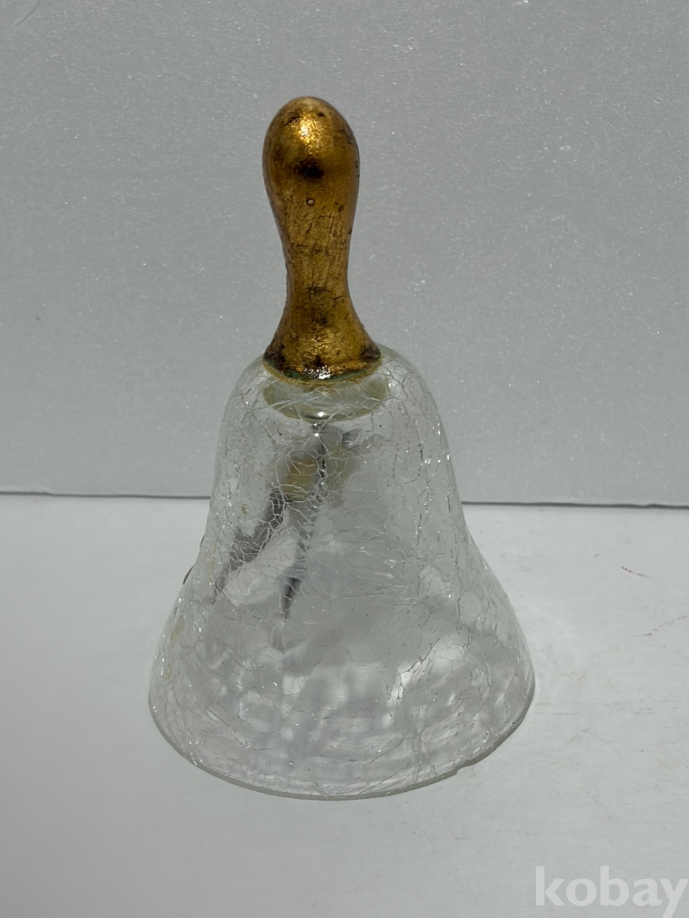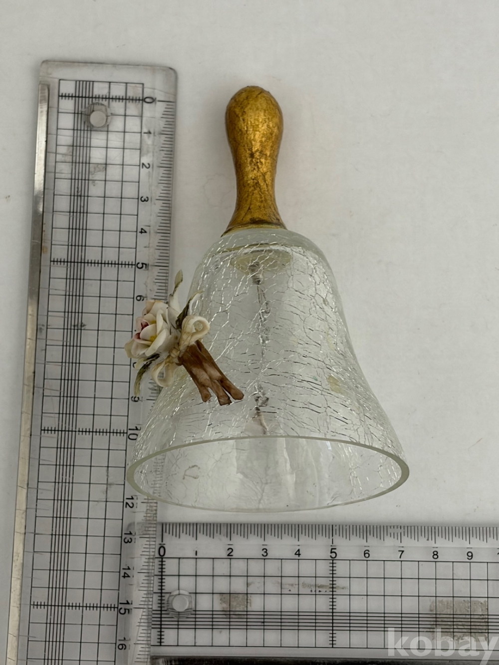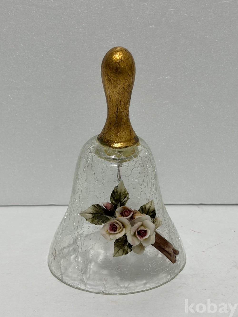 금색 손잡이와 세라믹 장미 꽃 장식이 있는 유리 종입니다