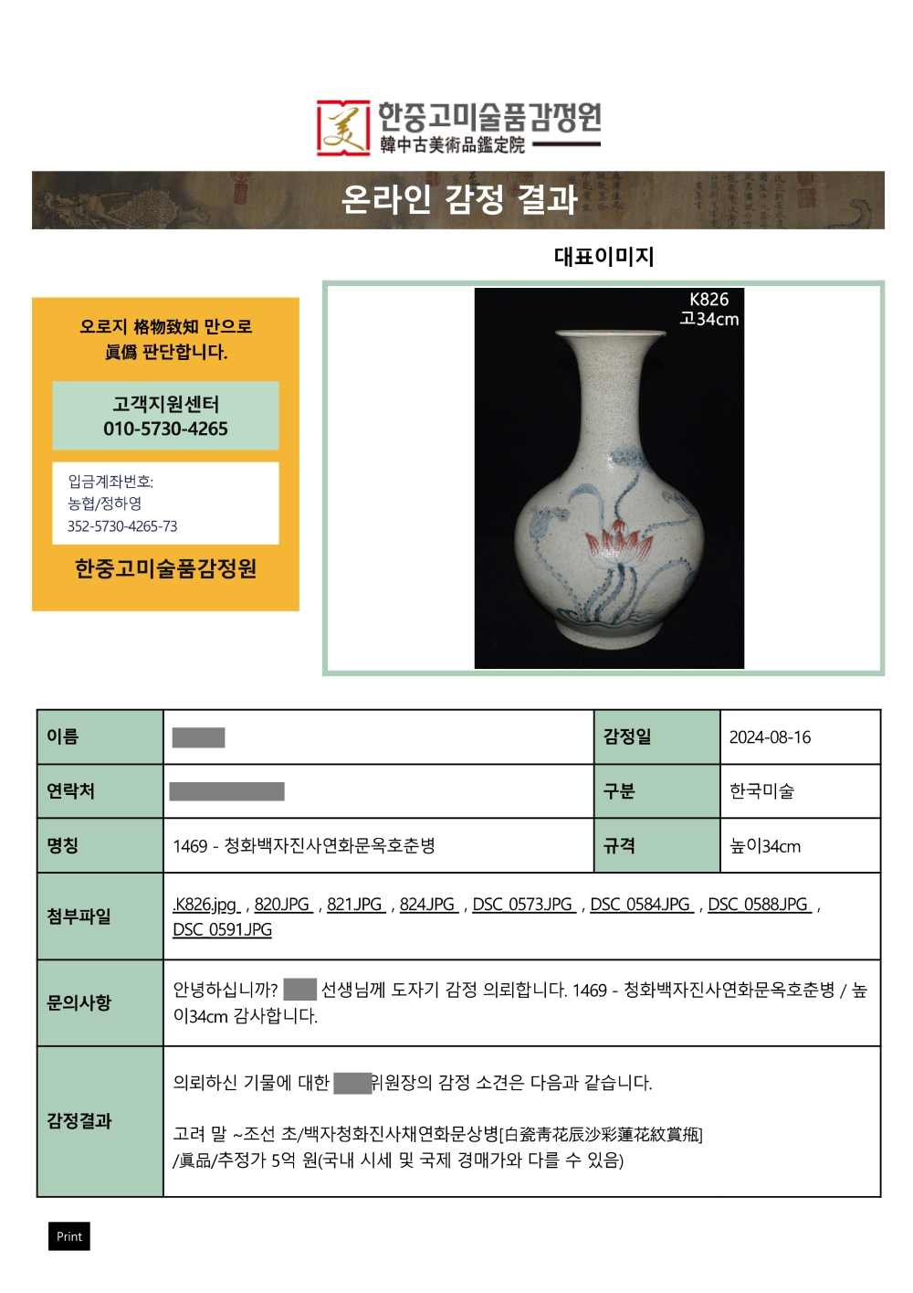 특히 기물을 받고 나서, 누구에게 보였더니 가짜라 하더라 하시며 반품하는 분들이 있는데 이런 분들은 절대 입찰하지 마십시요.