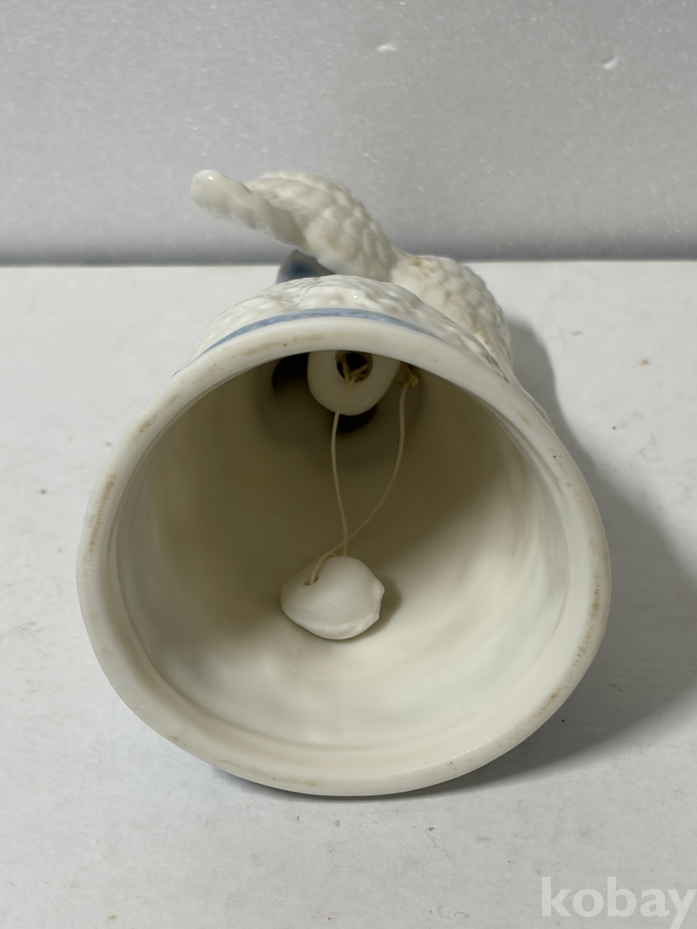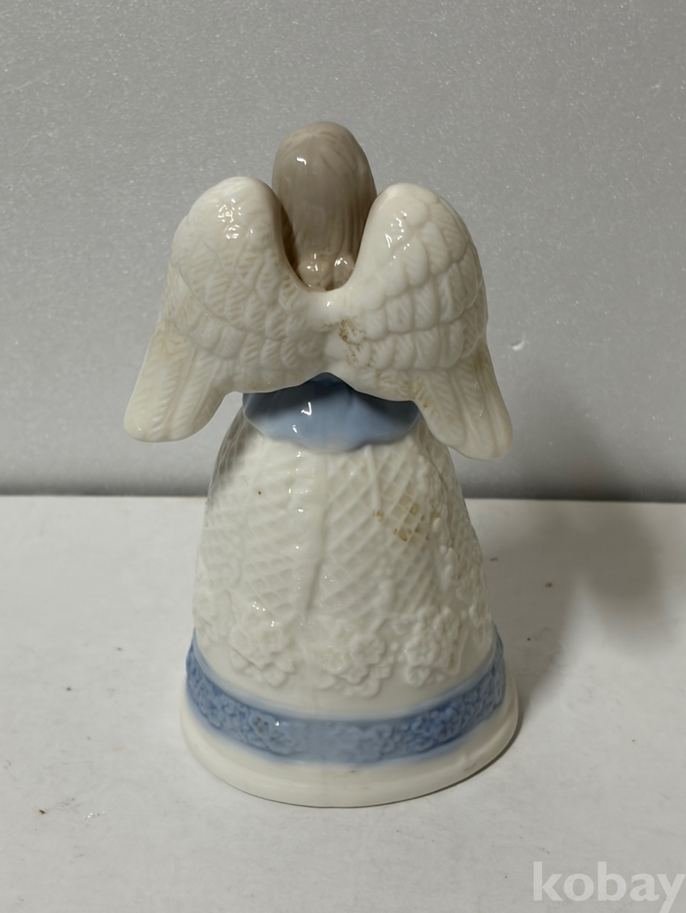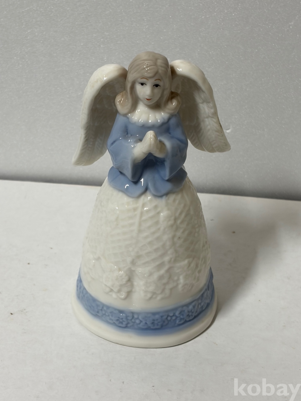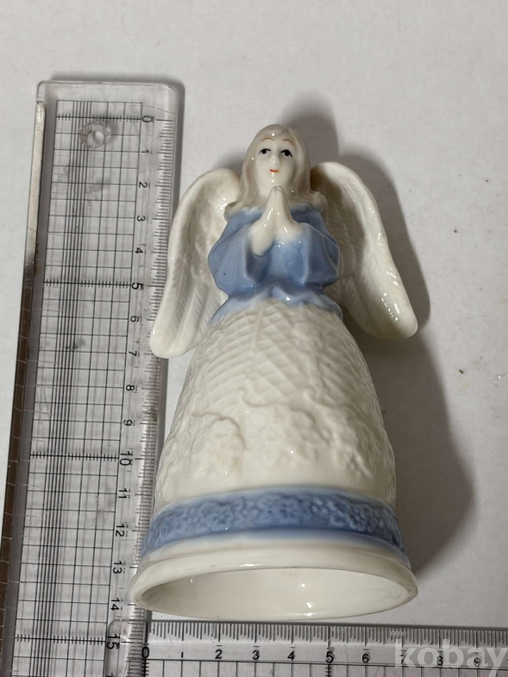 기도하는 천사를 묘사하며, 파란색과 흰색 유광 마감으로 제작된 도자기 종입니다.
