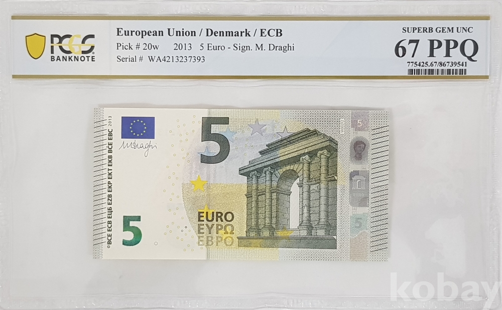 - 유럽연합 덴마크 2013년 5유로 PCGS 67 PPQ 인증 지폐