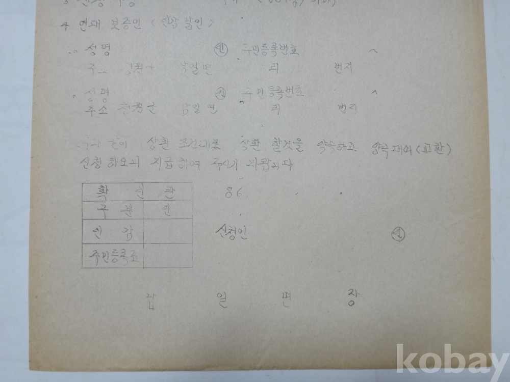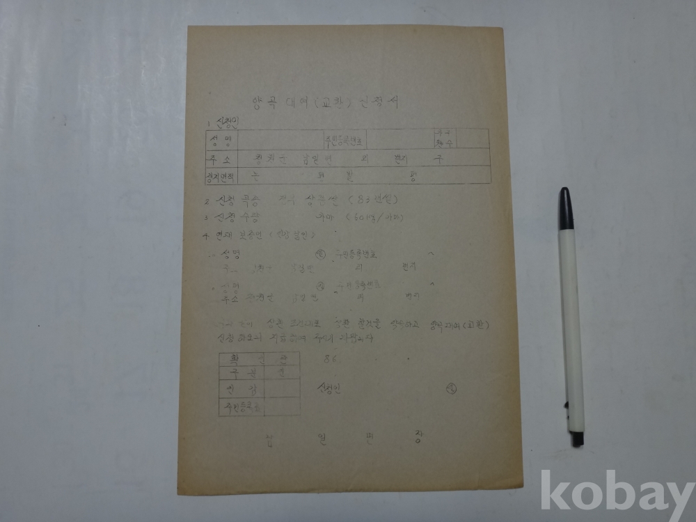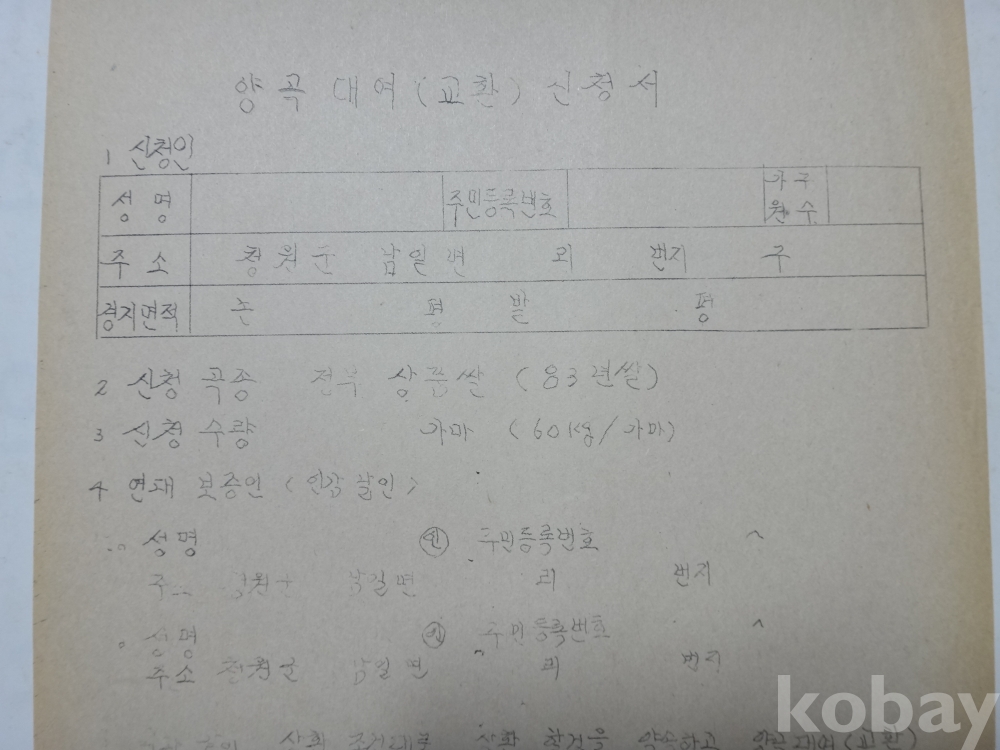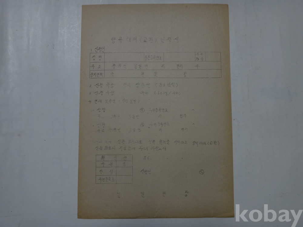 양곡 대여 (교환) 신청서 (1986년, 남일면장)