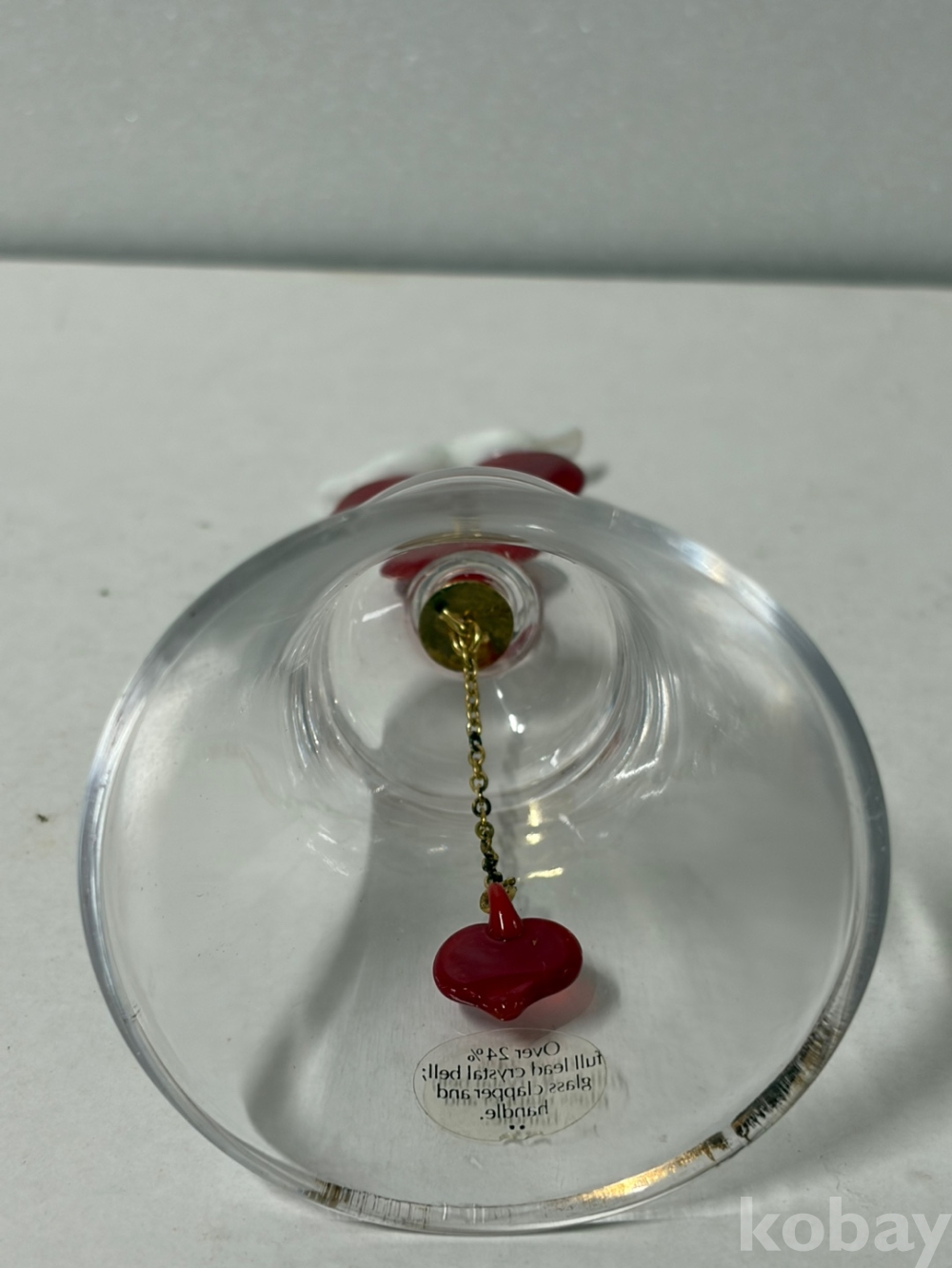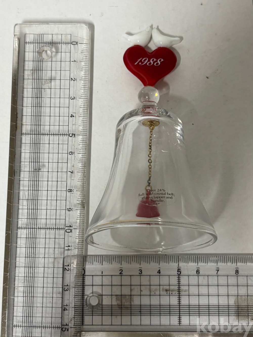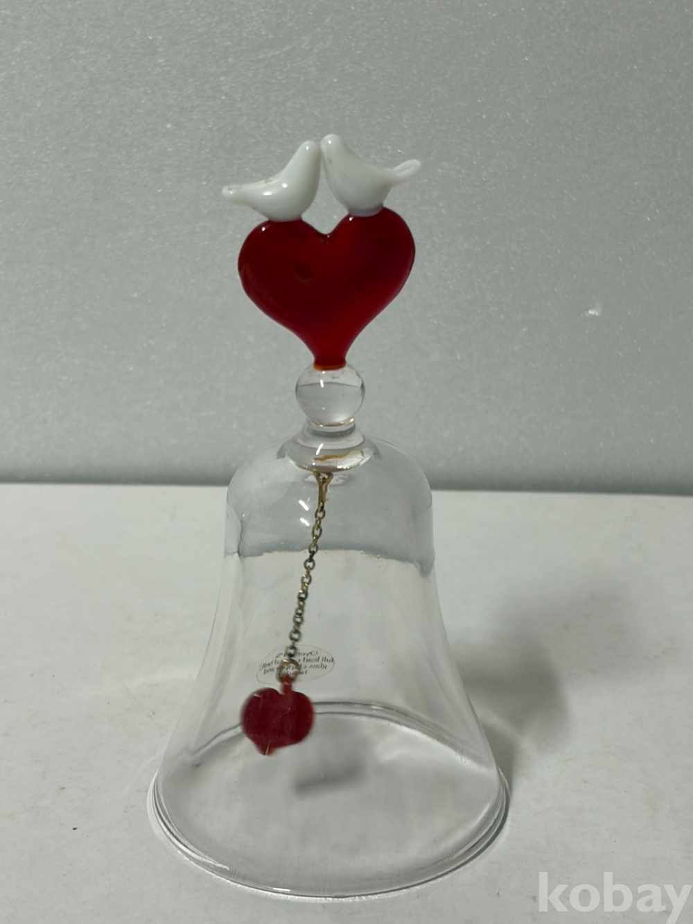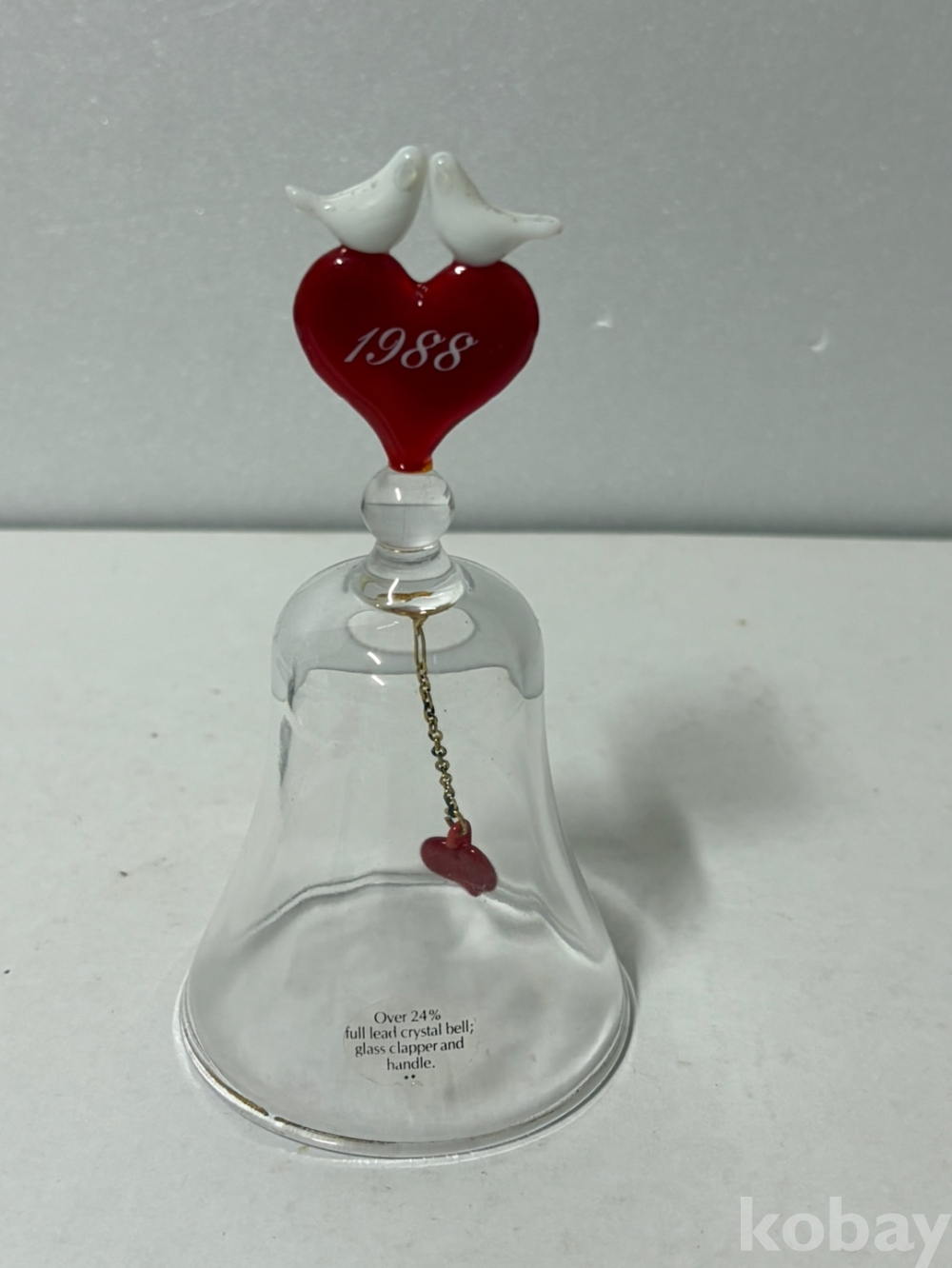 1988년 빨간색 하트 모양 손잡이 위에 흰색 사랑새 두 마리가 앉아 있는 크리스탈 종입니다.