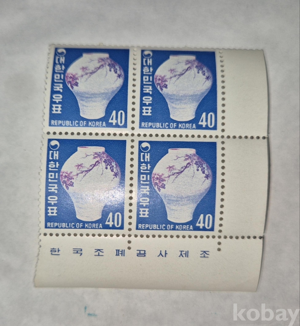 1969년에 발행한 제1차 그라비아 '조선백자 철사포도문호' 보통우표 40원 4매 명판부 블록입니다.