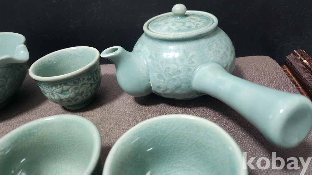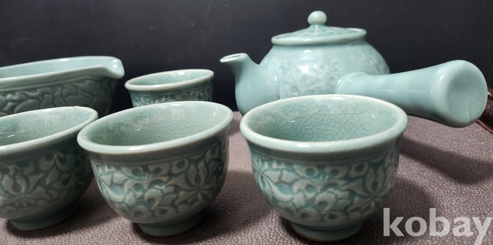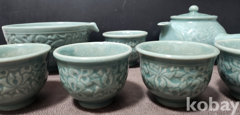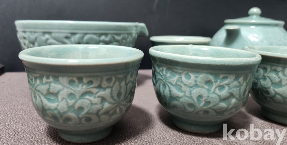 < 여주도자기 축제 전시 판매 作品 > 청자음각모란문다기 靑瓷陰刻牡丹紋茶器 < 미사용 박스 완비 >
