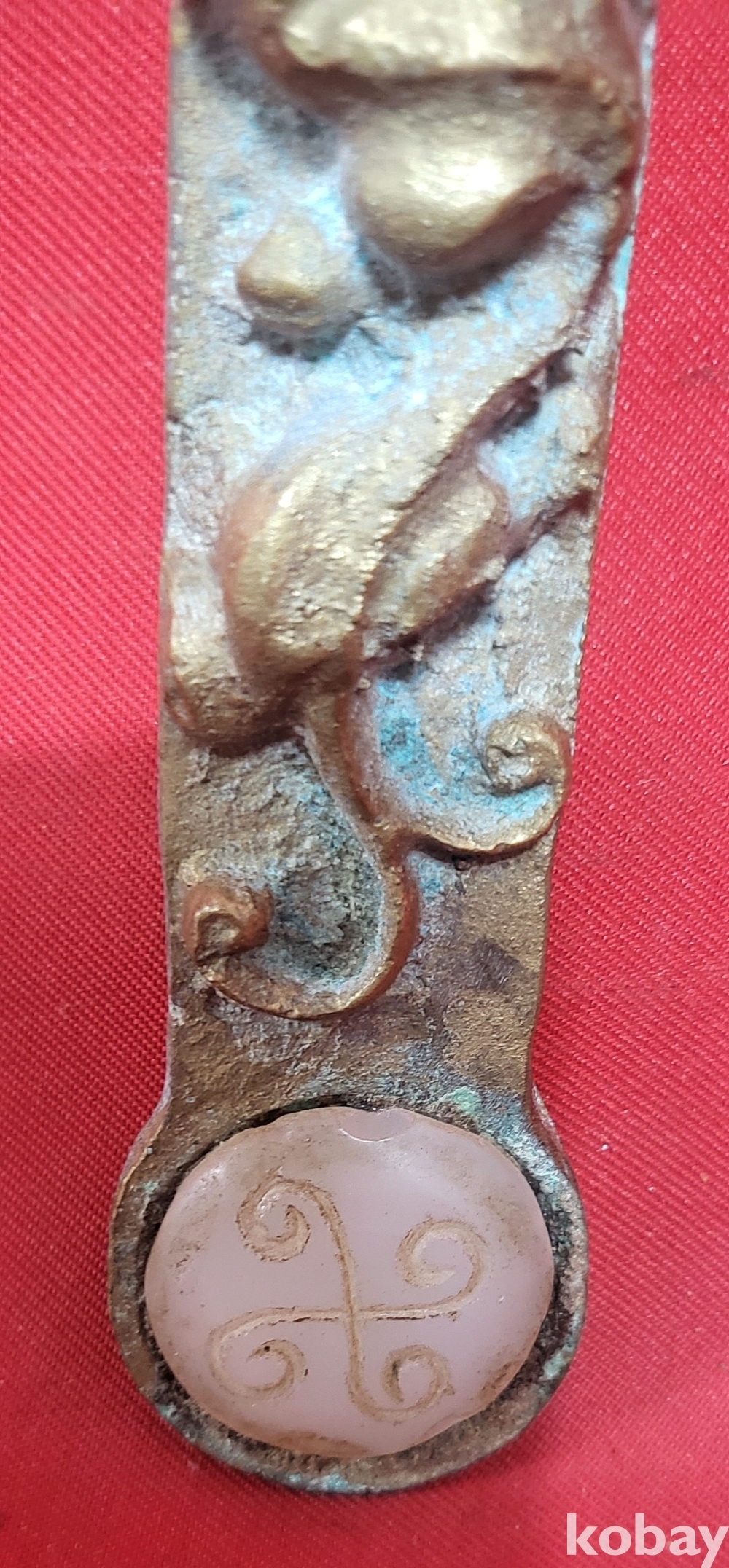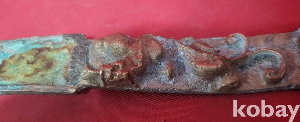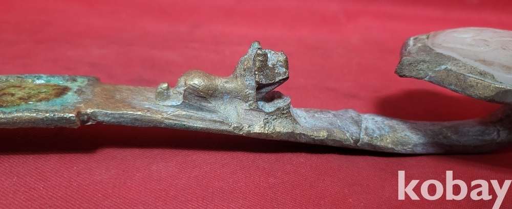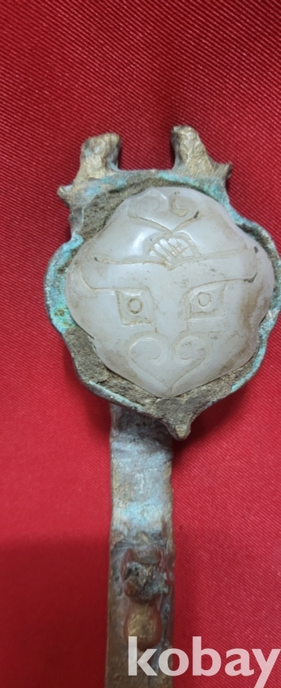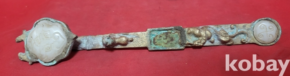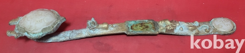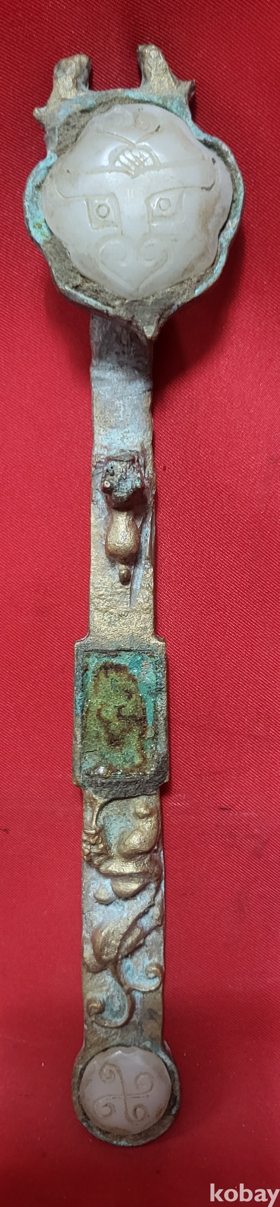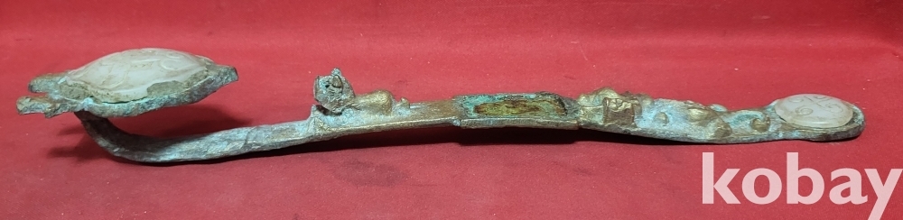짱짱한 연대 갖춘 황동에 백옥(白玉) 사자와 용문양 여의 (如意) 입니다,