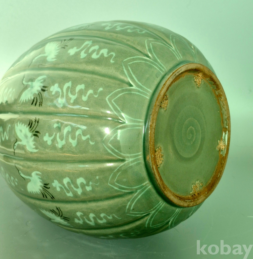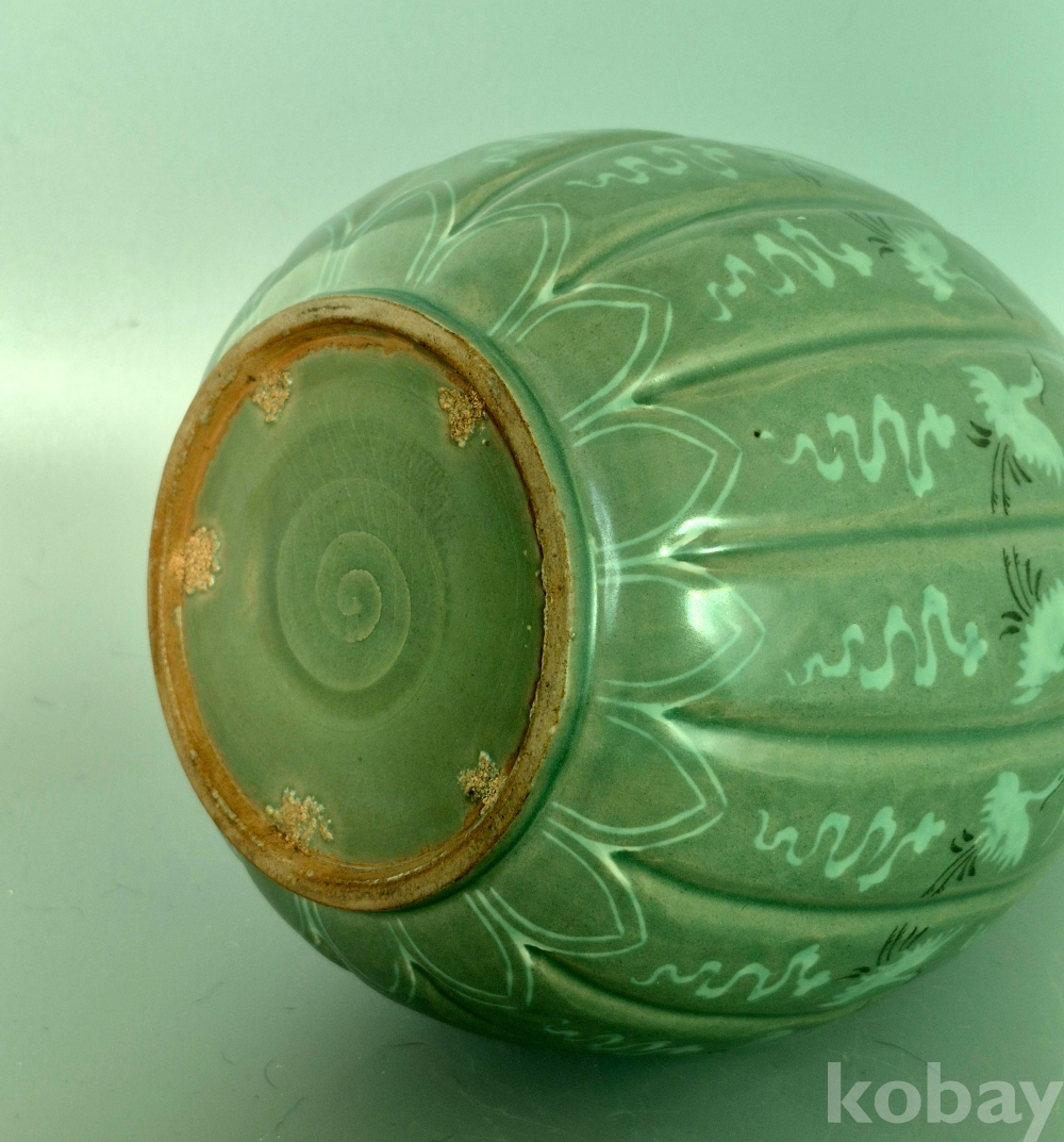 37cm의 커다란 대형으로, 전체적으로 매우 화려하며, 최고로 잘 빠진 주병이고, 밑굽을 보시면 제가 보기에 회오리 흔적이 있는 전형적인 고려자기 입니다.
