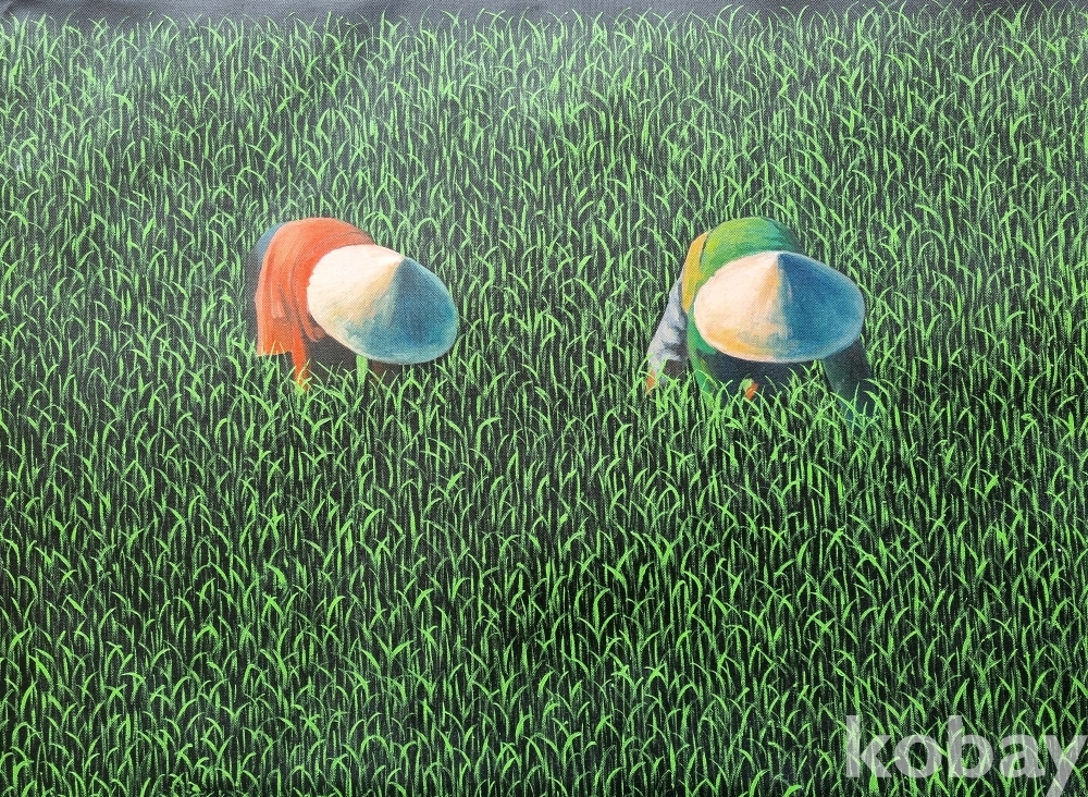 초록색 풀밭을 배경으로 두 인물이 몸을 숙인 자세로 배치돼 있으며, 화면 전반에 반복적인 풀의 묘사가 촘촘하게 구성돼 있다. 인물의 의복과 모자는 서로 다른 색감으로 대비를 이루며, 화면 중앙부에 자연스럽게 시선이 모이도록 구성돼 있다. 국내에서 일반적으로 사용되는 캔버스와는 다른 형식의 베트남 현지 캔버스가 사용된 작품이다.